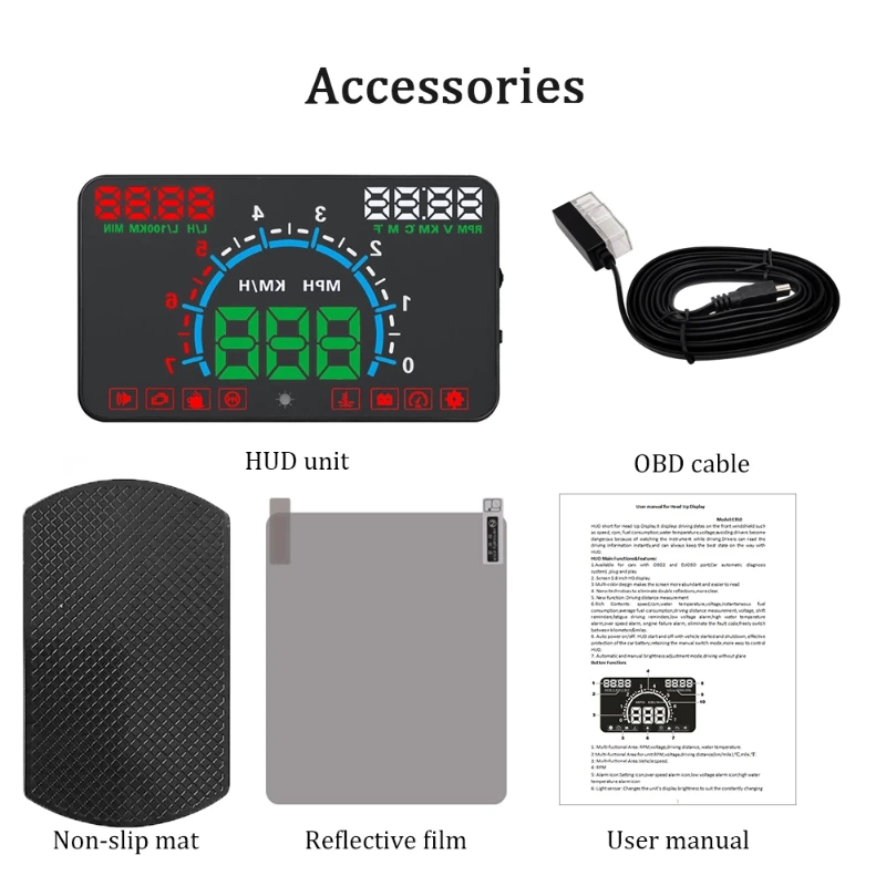 T3ED E350 5,8 "экран HUD Автомобильная головка вверх дисплей двигатель неисправность сигнализация для топливного бака спидометрOOTDTY100% новый и высокое качествоОсобенности:HUD короткий для дисплея головы вверх. Он отображает данные о вождении на лобовом стекле, такие как скорость, об/мин, расход топлива, температура воды, напряжение; Избегайте вождения становятся опасными из-за просмотра инструмента во время вождения.Водители могут мгновенно читать информацию о вождении и всегда могут поддерживать Наилучшее Состояние на пути с HUD.Основные функции и особенности HUD:1. Доступно для автомобилей с OBD2 и EUOBD портом (автомобильная автоматическая система диагностики), подключи и работай.2. Экран 5,8 дюймовый дисплей.3. Многоцветная конструкция делает экран более насыщенным и легче читать.4. Нано-технология для устранения двойных отражений, более четкая.5. Новая функция: измерение расстояния вождения.6. Богатое содержание: скорость, об/мин, температура воды, напряжение, мгновенный расход топлива, средний расход топлива, измерение расстояния вождения, напряжение, напоминания о смене, напоминания о усталости вождения, Сигнализация низкого напряжения, сигнализация с высокой температурой воды, сигнализация с превышением скорости, сигнализация неисправности двигателя, устранение кода неисправности, свободное переключение между километрами и милями.7. Автоматическое включение/выключение: HUD Пуск и выключение автомобиля, эффективная защита автомобильного аккумулятора; Сохранение режима ручного переключения, более легкое управление HUD.8. Автоматический и ручной режим регулировки яркости, вождение без бликов.Комплект только для автомобильных дисплеев, другие демонстрационные аксессуары на картинке не включены!Спецификация:Технические параметры:Температура окружающей среды: -40 ℃ ~ + 80 ℃,Атмосферное давление: 86 ~ 106 кПаОтносительная влажность: 10% ~ 95%Шум окружающей среды: ≤ 60 дБ (A)Уровень звукового сигнала: ≥ 30 дБ (A)Рабочее напряжение: 9 В ~ 16 В постоянного тока (12 В постоянного тока/400 мА)Размеры: 136x80x1 5 мм/5.35x3.15x0.59inchЦвет: как показаноКоличество: 1 комплектПримечание: 1. Допускается погрешность в 0-1 см из-за ручного измерения. Пожалуйста, убедитесь, что вы не возражаете, прежде чем сделать ставку.2. В связи с разной конфигурацией разных мониторов изображение не отображает фактический цвет товара. Спасибо!Посылка включает в себя:1 комплект Автомобильный дисплей