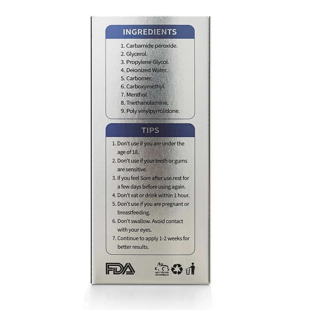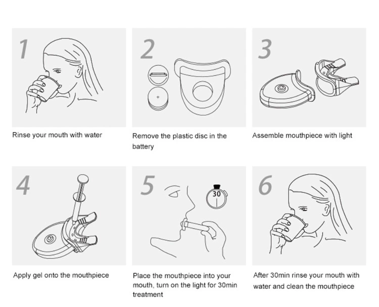 О1: при нормальной ситуации вы можете использовать один раз в день по 15-20 минут каждый раз. Используйте не более 1 мл геля для отбеливания зубов каждый раз. Поставляется с небольшой крышкой, просто накройте ее после использования, чтобы гель не окислялся.