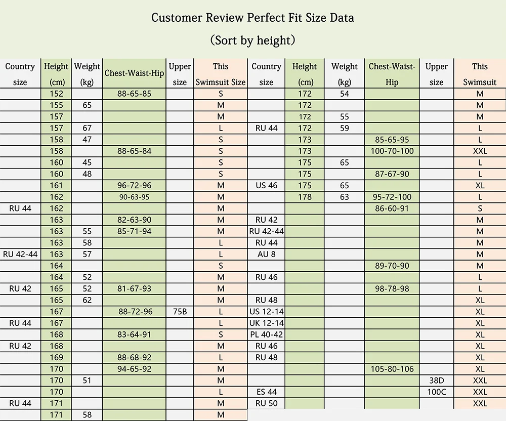 О: Наша идеальная посадка на рост клиента составляет около 149-178 см. Все клиенты могут найти идеальный размер. Если вы не уверены по поводу которых Размеры вам подойдет, вы можете проверить наше описание Размеры chart↓↓↓Customer обзор идеально подходит Размеры данных chart↓↓↓ купальник с длиной стопы данных ↓↓↓ в том случае, если вы беспокоитесь об объеме Размеры, вы можете связаться с нами, чтобы помочь вам выбрать подходящий размер.