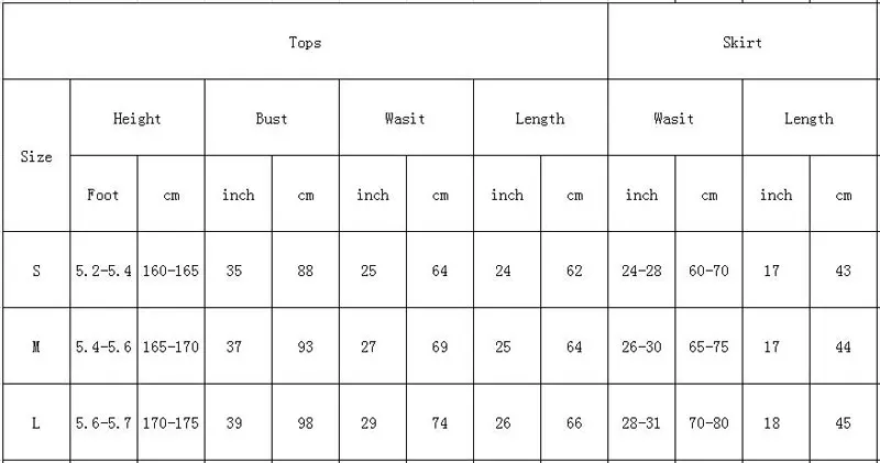 Включает в себя: Топ + юбка + аксессуары для шеи + головной убор + перчатки + носкиСоветы:1 Пожалуйста, проверьте информацию о размерах перед тем, как вы покупаете. (все размеры указаны в см, пожалуйста, примите во внимание, что 1 см = 0,39 дюйма, 1 дюйм = 2,54 см);2. Пожалуйста, укажите правильный адрес после оплаты;3. Транспортировка на большие расстояния. Транспортировка может привести к появлению морщин в одежде.4 таможенные пошлины, местные налоги и сборы не включены в стоимость товара или стоимость доставки.5. Ваши отзывы очень важны для нас, пожалуйста, уделите несколько секунд, чтобы дать отличные отзывы, если вы удовлетворены нашими продуктами и услугами, большое спасибо!100% Новый брендЭта информация о размерах только для справки. Пожалуйста, сравните приведенные размеры с вашими и, пожалуйста, учтите что допускается погрешность в 1-3 см разницу в размерах ввиду того, что Замеры производились вручную, спасибо (все размеры указаны в см и, пожалуйста, примите во note1cm = 0,39 дюймов).Типы тела, замеры песка специфические конструкции могут незначительно отличаться в размерах. Цвет товара, отображаемый на фотографиях, может немного отличаться на мониторе вашего компьютера, так как мониторы не откалиброваны так жеМы заботимся о наших уважаемых клиентах и всегда будем стараться вам помочь, надеемся установить с вами долгий бизнес