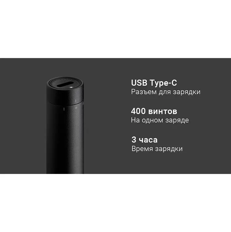 Электрическая отвертка работает от аккумуляторной батареи емкостью 350 мАч. Одна зарядка позволит закрутить более 400 винтов и других крепежных элементов. Подзарядка производится через порт USB Type-C. Диаметр корпуса составляет всего 16.4 мм. Благодаря этому ее можно задействовать в самых труднодоступных местах, где обычный шуруповерт просто не поместится