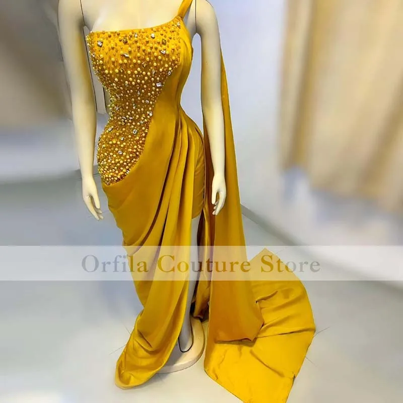 Желтые атласные блестящие исламские блестящие платья на одно плечо 2021 арабские официальные платья для выпускного вечера