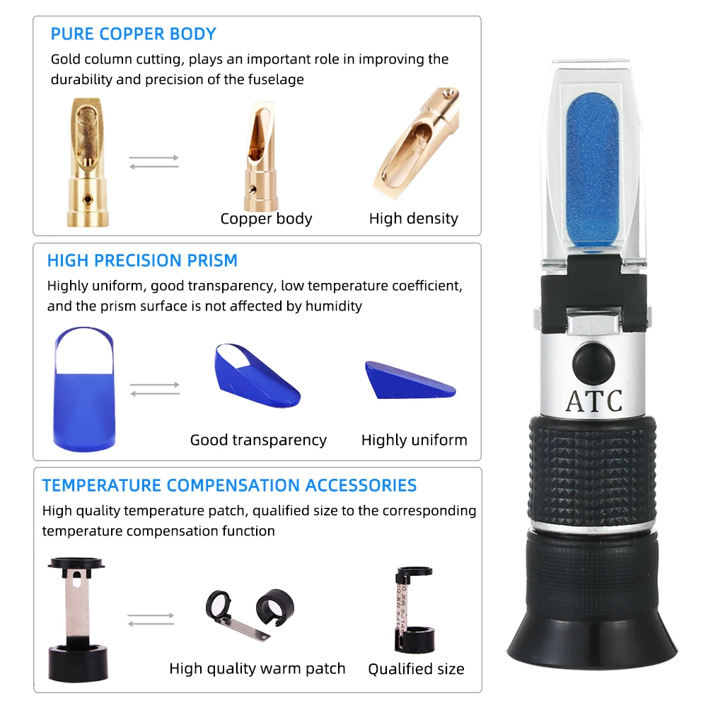 С встроенным диапазоном компенсации ATC (автоматическая компенсация температуры) от 10 °C до 30 ° для использования на местах, без необходимости повторной калибровки после изменения температуры окружающей среды. Мягкий резиновый элемент для удобного просмотра со шкалой Измерение, обеспечивающее прямое считывание точных результатов тестирования, гарантирует удобство в использовании и калибровку и позволяет использовать длинный Регулируемый ручной светильник с фокусировкой, что означает, что аккумулятор или источник питания не требуются. Мягкая и удобная нескользящая подошва Резина