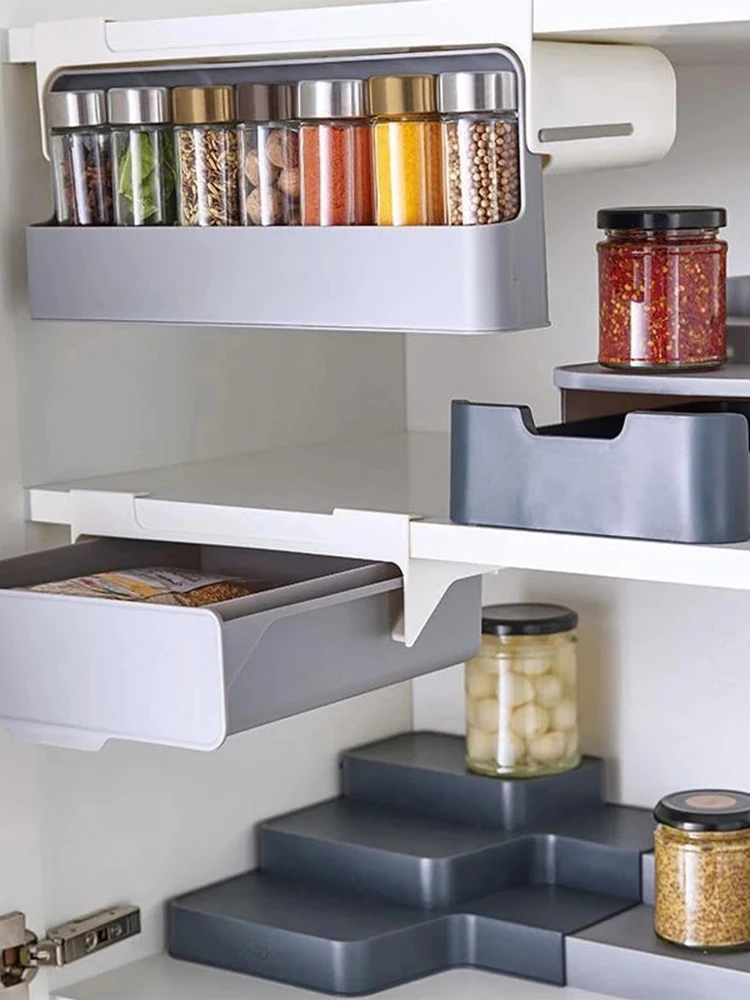 Со шкафом часто в премиум-класса, под полкой spice organizer дизайн использует неиспользованное пространство под полкой. Имеет умный выдвижной отсек, который вмещает до семи стандартных банок для специй (не входит в комплект).