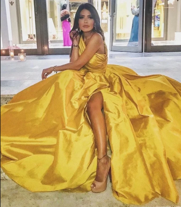 Женское винтажное вечернее платье, длинное желтое платье из тафты с разрезом, на молнии сзади, официальное платье для вечеринки