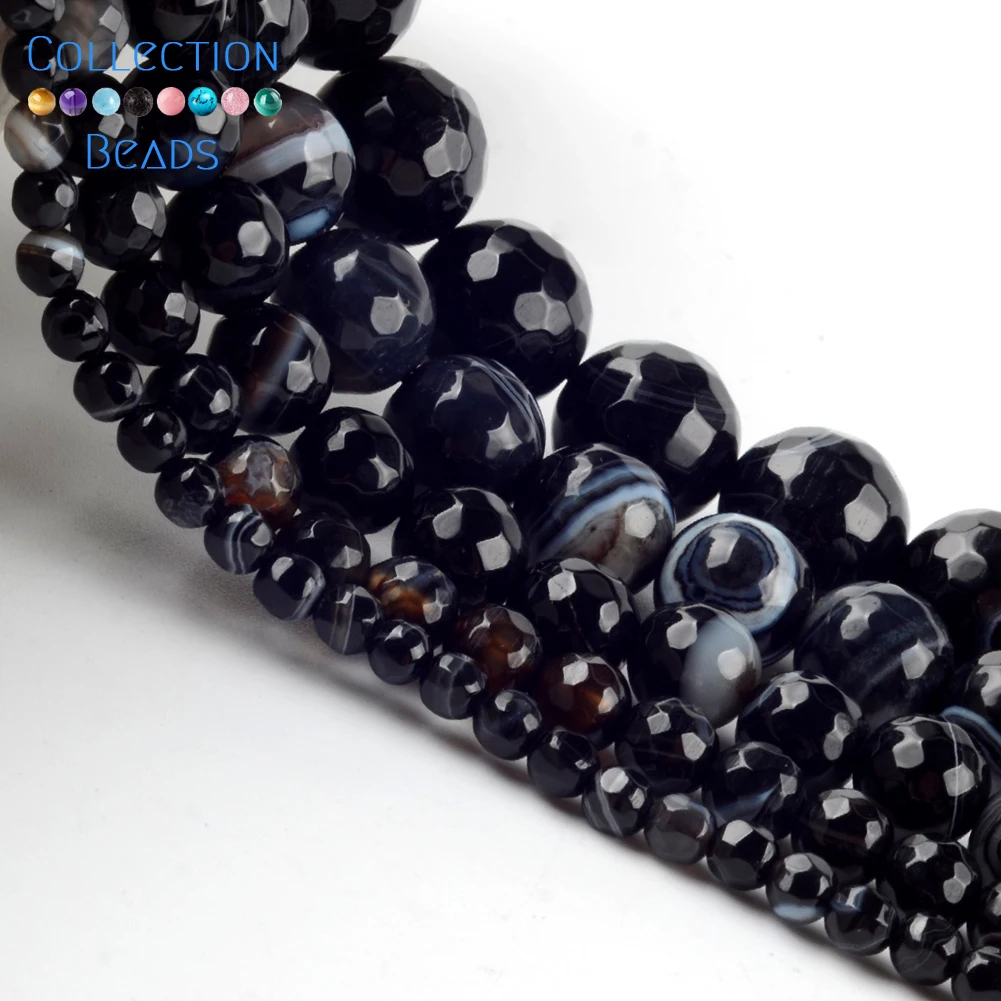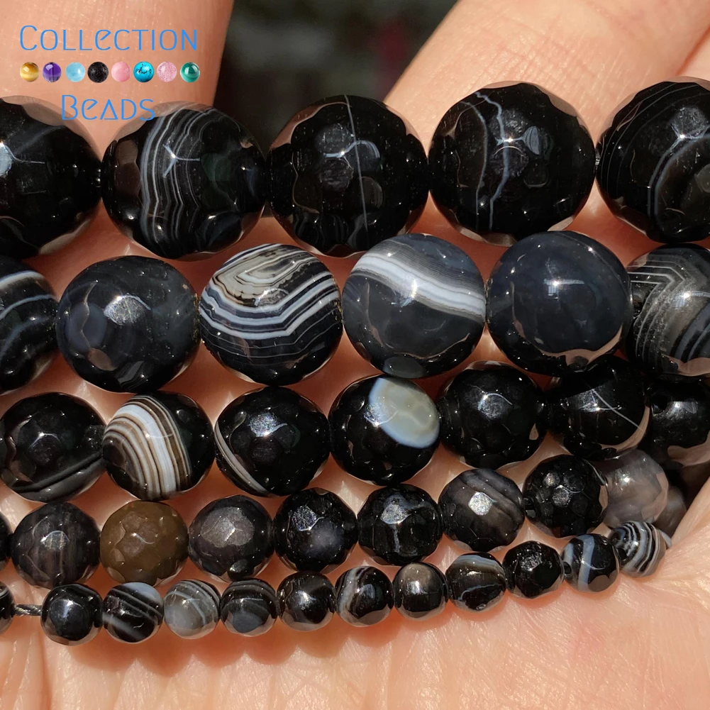 4-12 мм граненые Черные Полосатые агаты из натурального камня Круглые свободные бусины для изготовления ювелирных изделий Аксессуары для браслетов DIY 15''