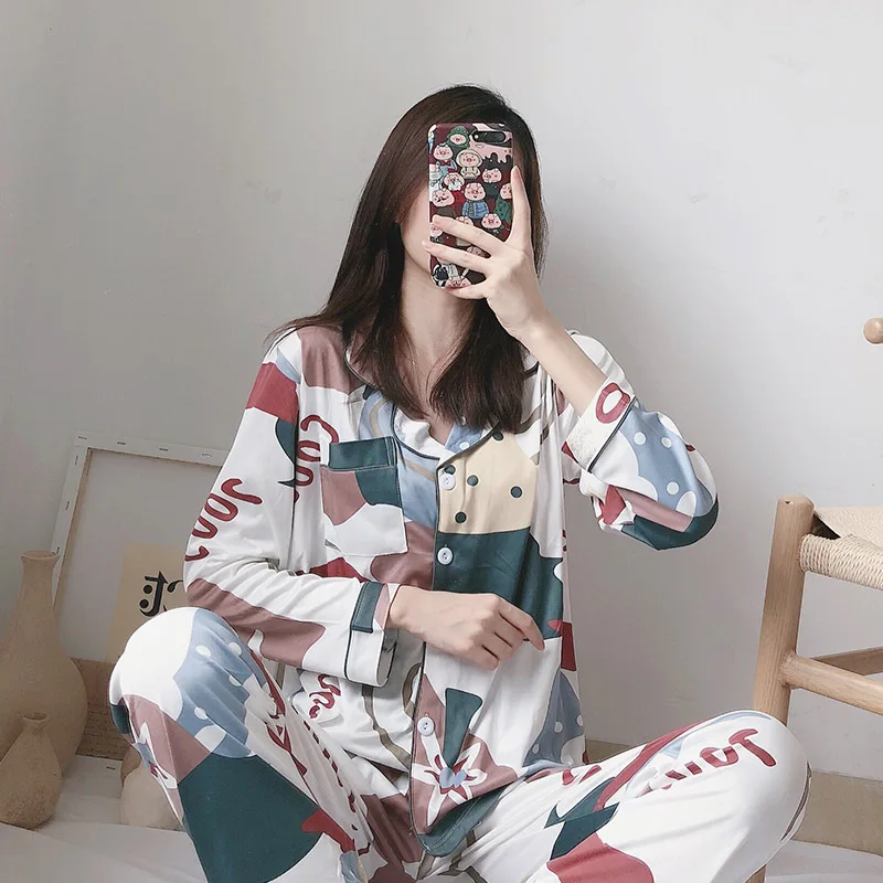 Женский пижамный комплект в Корейском стиле, одежда с длинным рукавом и длинные брюки, комплект из 2 предметов, повседневная одежда для сна с отложным воротником, осень 2021