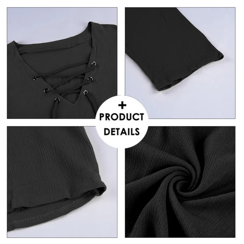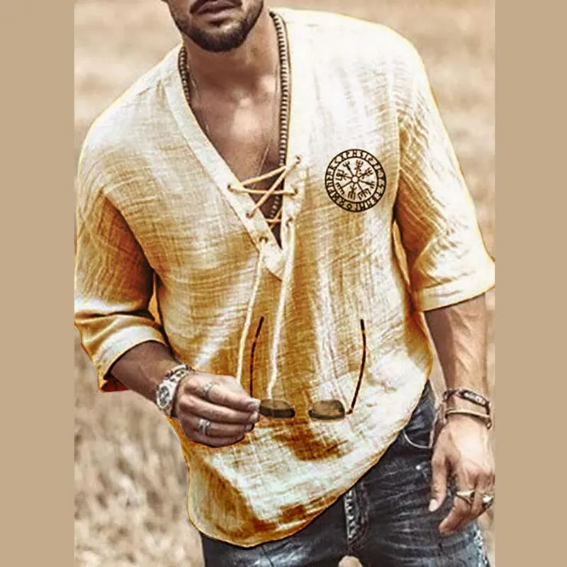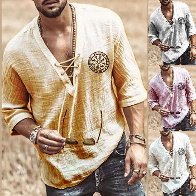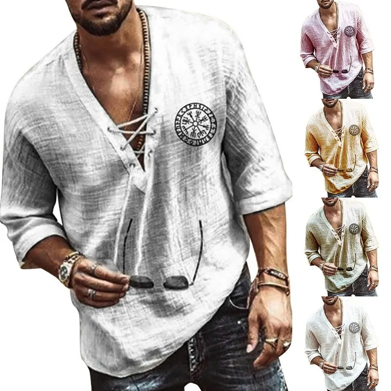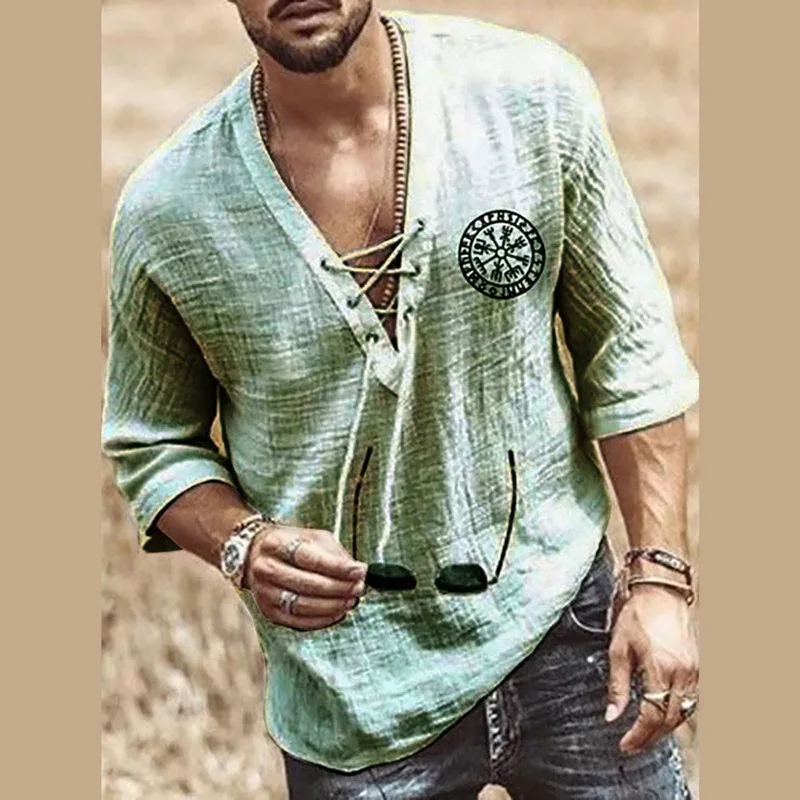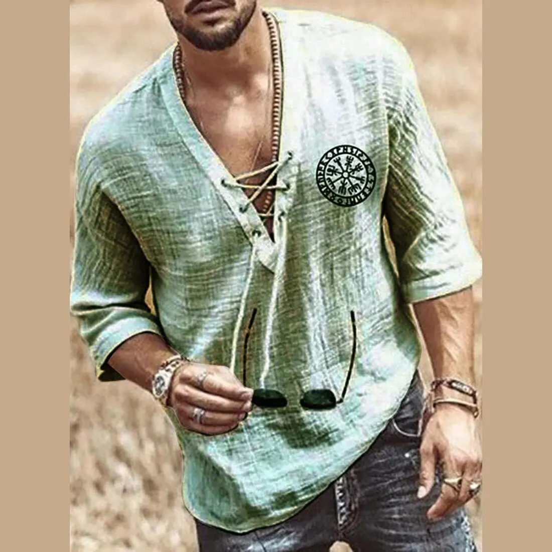 Рубашка Мужская льняная с V-образным вырезом, полурукавом и шнуровкой