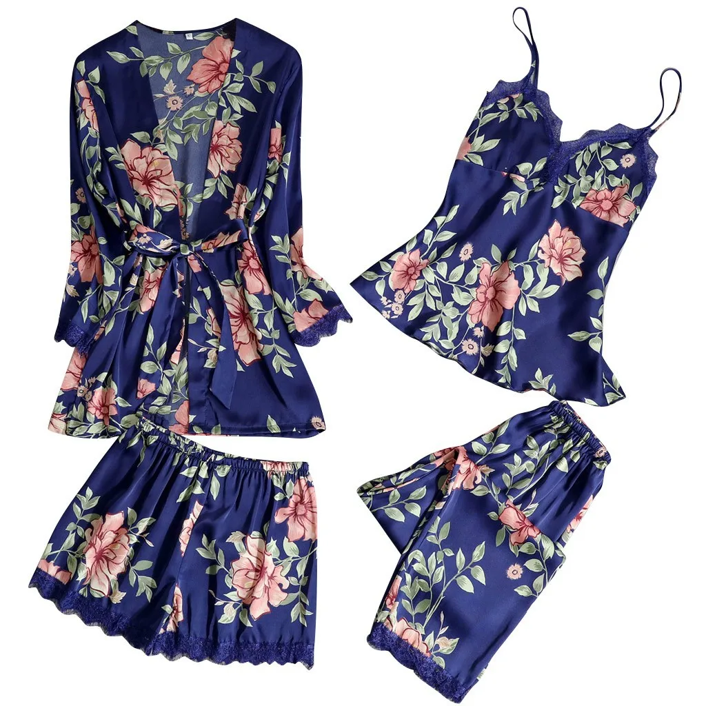 Особенности:Посылка входит: женский пижамный комплектРазмер: S-2XLМатериал: полиэстерТип: твердыйНовые женские пижамные комплекты из 4 предметов, пижамы из искусственного шелка, пикантные кружевные модные весенне-осенние комплекты домашней одежды.