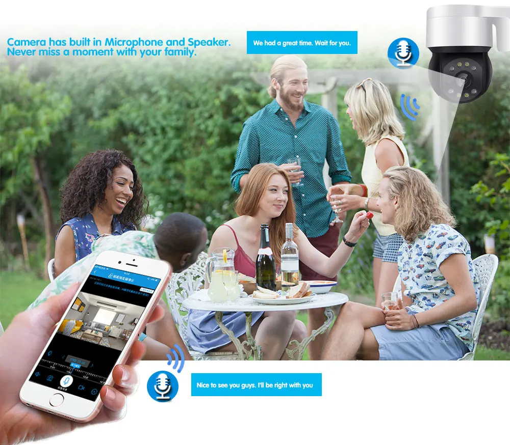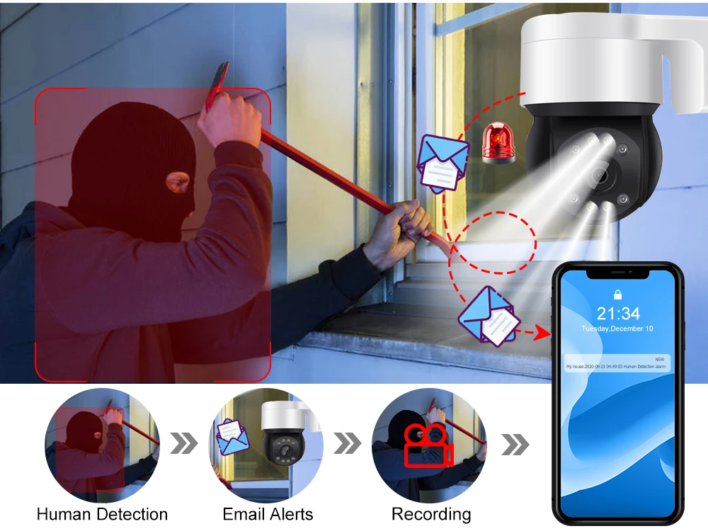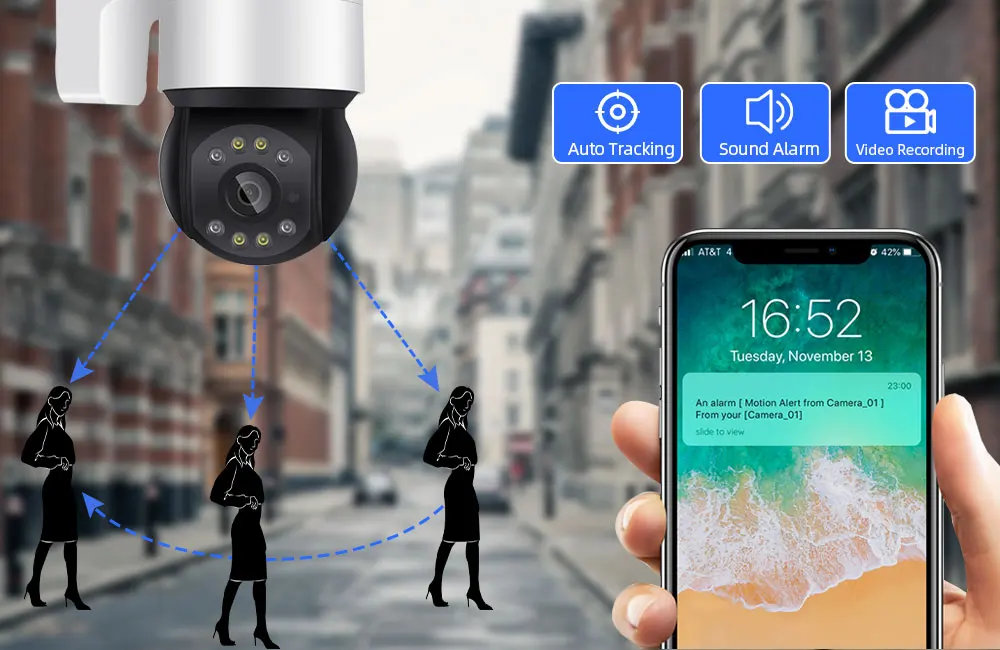 Камера видеонаблюдения автоматически отслеживает движение, оповещение о тревоге будет отправлено на ваш телефон вовремя, когда кто-то придет к вам домой