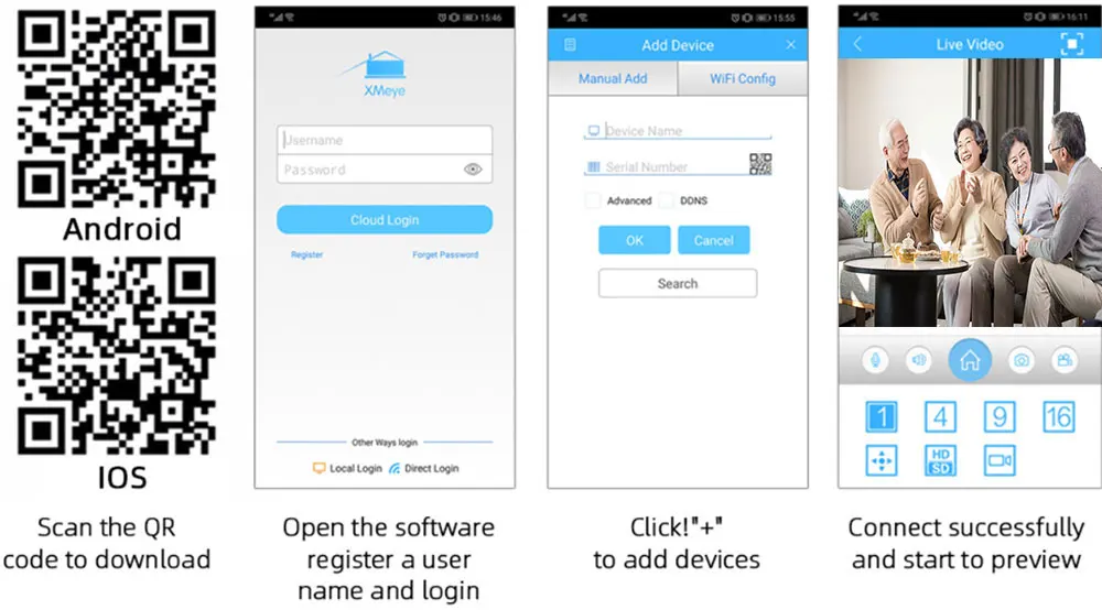 Простая настройка, всего 4 шага для просмотра мобильный телефон, просмотра видео в режиме реального времени из любого места и в любое время с помощью смартфона,Таблица или ПК с передовой технологией P2P, вы можете получить удаленный доступ к вашей системе в течение нескольких минут или меньше, нет необходимости в переадресации,Удаленный доступ никогда не был таким простым!