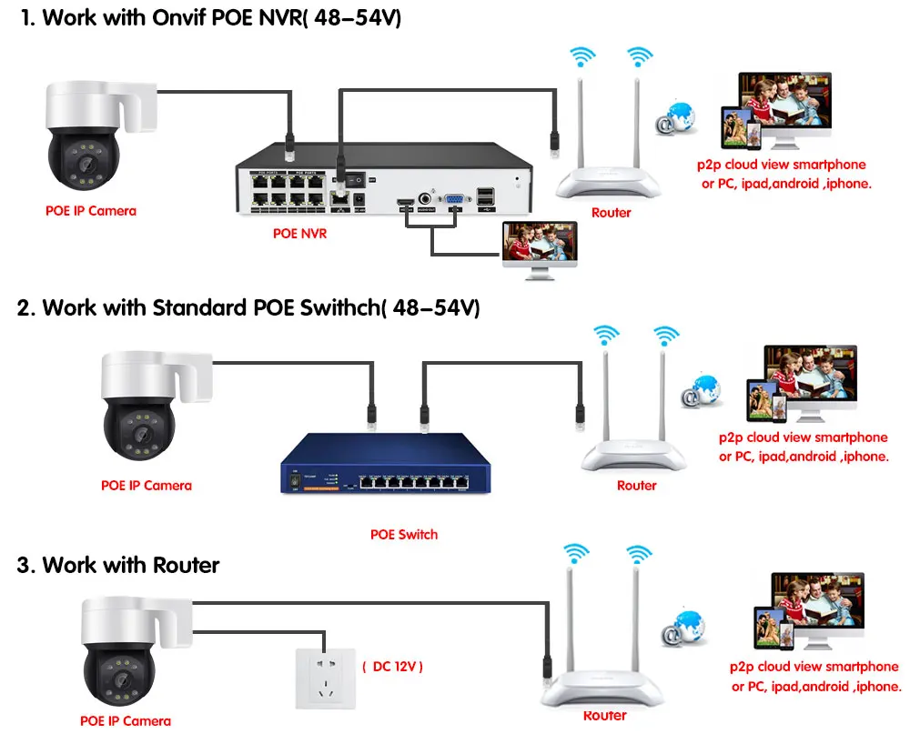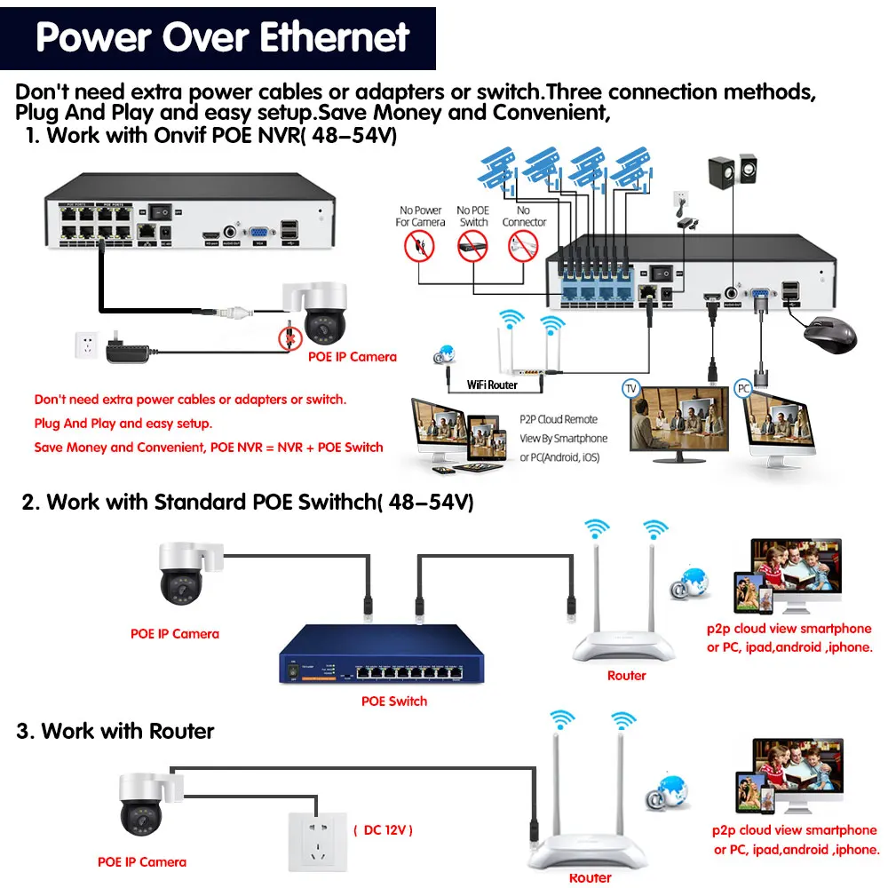 Нет дополнительных кабелей питания или адаптеров, просто подключив ip-камеру к NVR с помощью одного кабеля, вы можете легко завершить установку без знания о компьютере или сети и начать наслаждаться супер простым мониторингом среди вашего смартфона, планшета или ПК.Экономьте деньги и удобный POE NVR = NVR + POE коммутатор, подключи и работай и простая настройка!