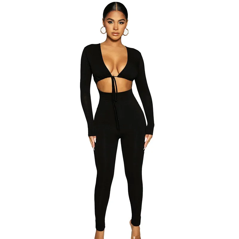 Женские комбинезоны, однотонные белые, черные комбинезоны с длинным рукавом и глубоким V-образным вырезом, брюки со шнуровкой, Клубные комбинезоны с вырезами для фитнеса, 2021