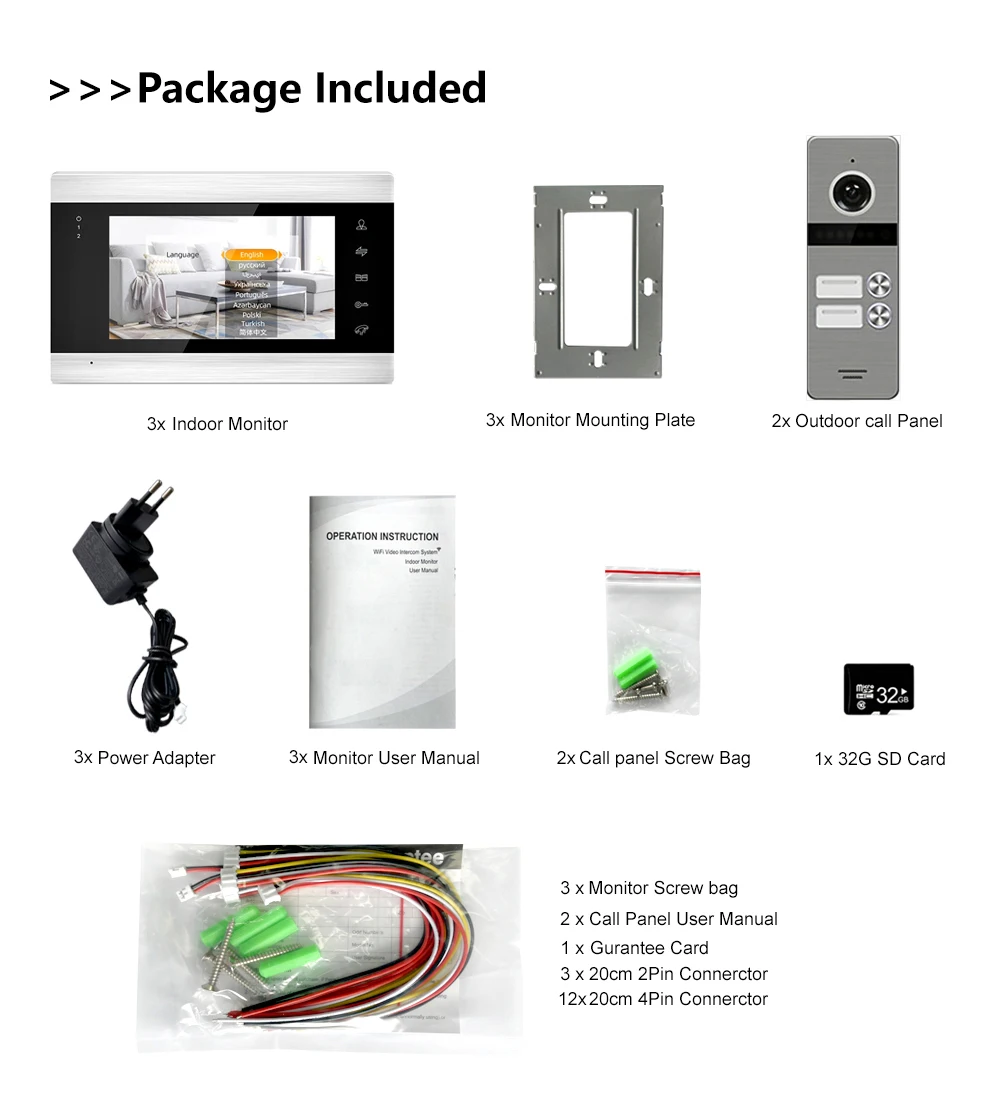 Максимальная поддержка соединяется с 2 наружными панелями вызова + аналоговыми 2 камерами (или PIR детекторами) + 6 мониторами в одной системе. PIR датчик и CCTV камера, установленная для работы вместе, может оповещать и записывать видео (камера с индивидуальным питанием).