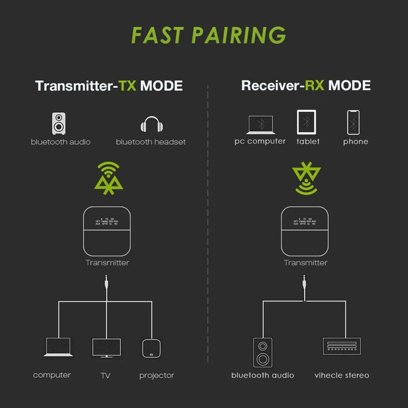【Двойное сопряжение + Автоматическое подключение 】 поддержка двойного потока (режим TX и режим RX), передача может Подключать два аудиоустройства и приемники Bluetooth одновременно. Адаптер Bluetooth имеет функцию памяти и автоматически подключается к вашим устройствам, которые были сопряжены до этого при включении.