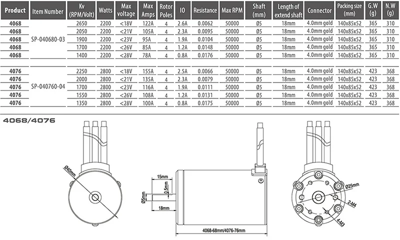 Особенности:4-полюсный 12 Слот hi-крутящий мотор дизайнВысокое качество: CNC обработанный алюминиевые заготовки 6061 T6 радиатор, высокая чистота медные обмотки максимальная эффективность, высокая RPM ABEC5 негабаритные подшипникиУниверсальный, подходит для всех 1:8 2S, 3S, 4S RC автомобилейПрецизионный сбалансированный ротор, гладкость для лучшей надежности и максимального оборотов в минутуСтатор-супер тонкий (0,35 мм) ЛаминированиеХарактеристики:Бренд: SURPASSHOBBYСерия: KKНазвание: 4068 RC моторКВ (об/мин/Вольт): 2050кв 2650кв опциональноВатт: 2200Макс. Об/мин: 50000Максимальное напряжение: <21 вМакс Ампер: 105AПолюсы ротора: 4Диаметр: 39,5 ммДлина: 68 ммВал: 5,0 ммДлина вала: 18 ммРазъем: 4,0 мм золотоВес: 310 гИнформация о посылка:Размер посылка: 140x87x52 мм/5,51x3,43x2,05 дюймаВес посылка: 365 г/12,88 унцийПосылка с общей коробкойПосылка включает в себя:1 x бесщеточный мотор SURPASSHOBBY KK 40681 х руководство на английском языке