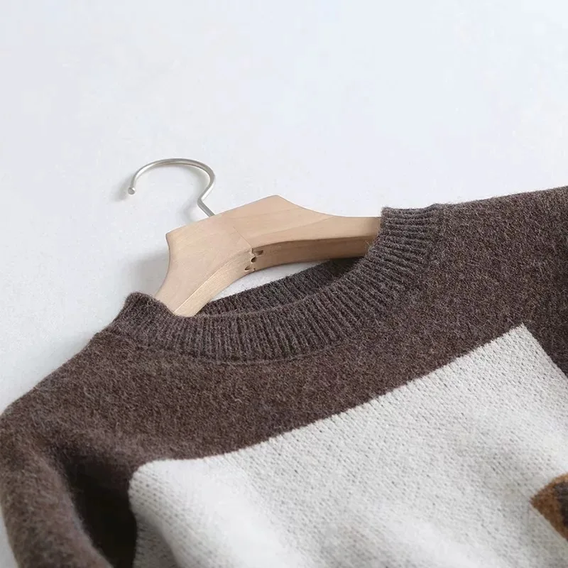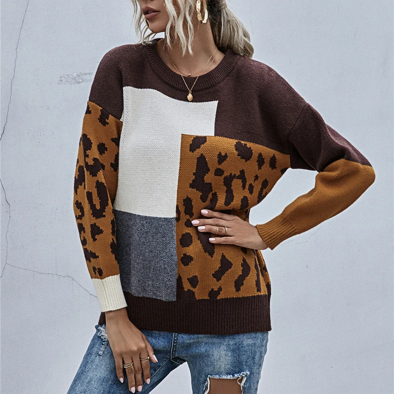 Женский трикотажный свитер с круглым вырезом, леопардовым принтом и длинными рукавами