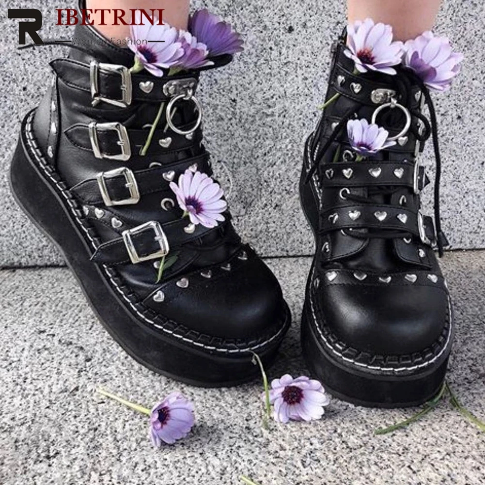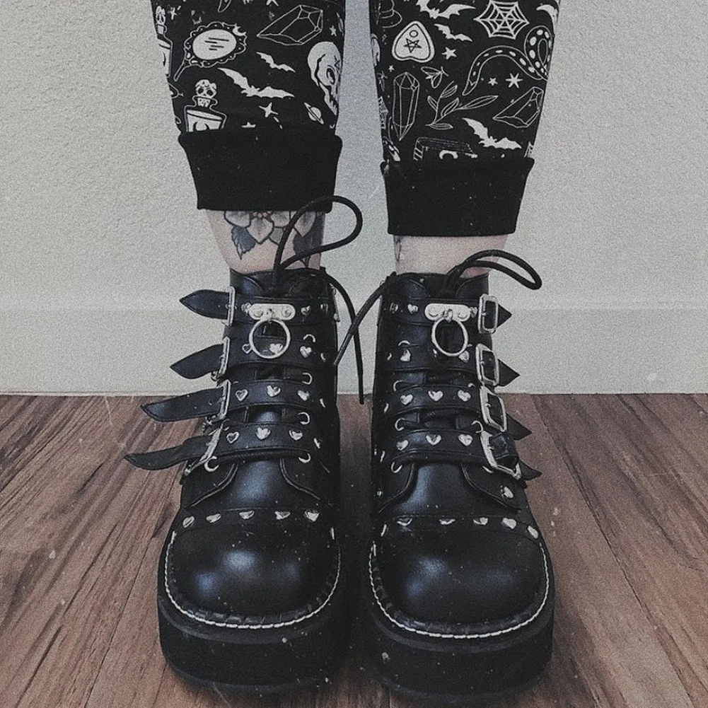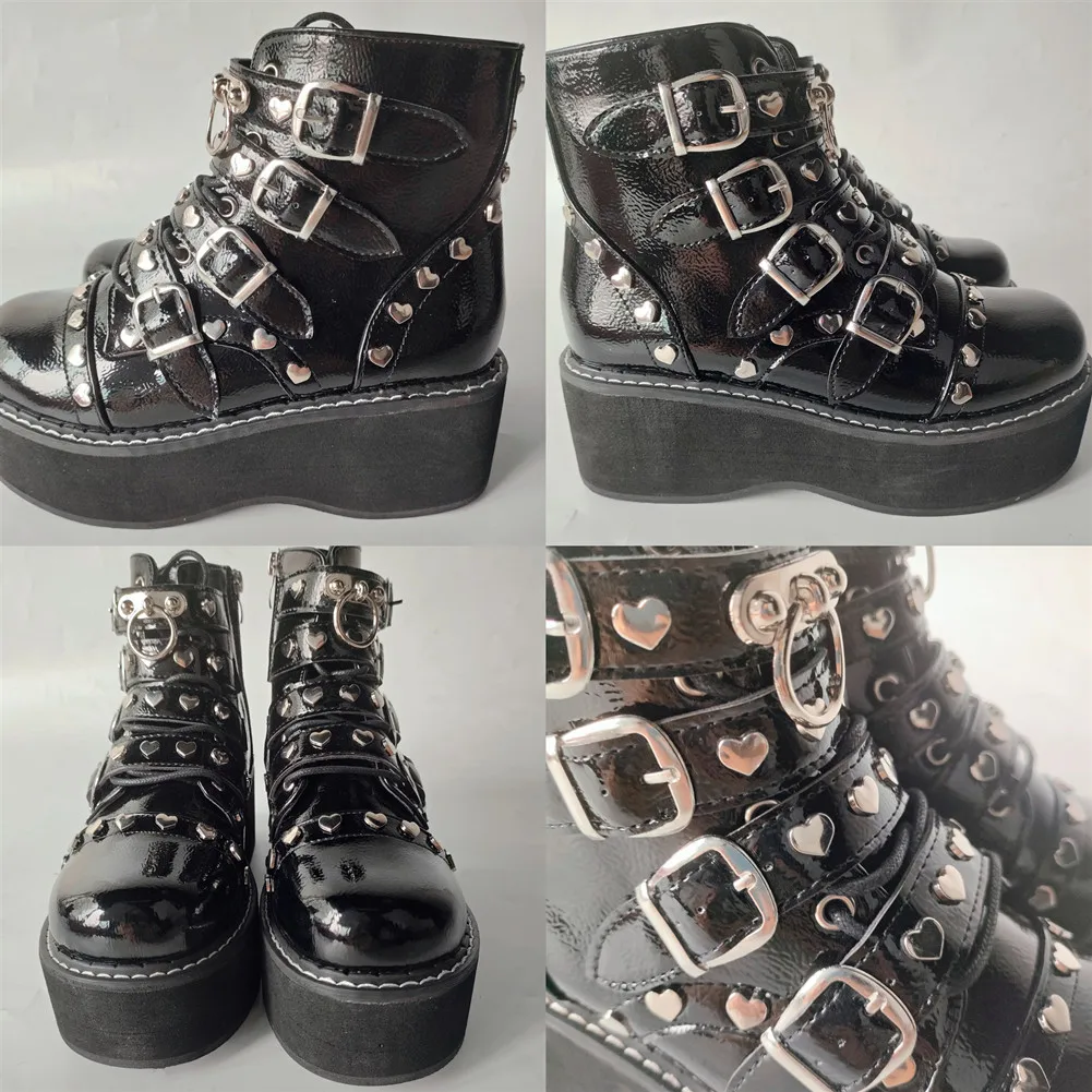 Женские ботильоны на танкетке, повседневные ботинки в готическом стиле с заклепками в форме сердца, со шнуровкой и пряжкой, 2021