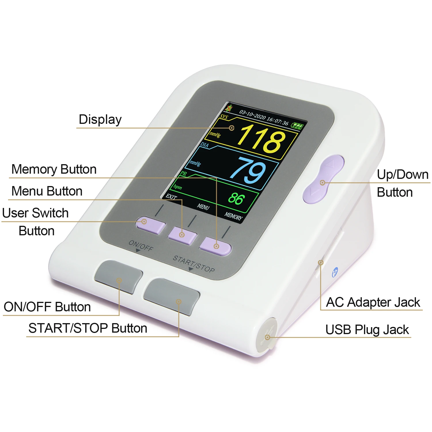 ВведениеCONTEC08A-это настольный электронный Sphygmomanometer, цветной ЖК-дисплей высокой четкости, поставка английского/китайского интерфейса, сильная видимость. Полностью автоматическое измерение артериального давления, это может быть бытовой sphygmomanometer, который используется для взрослых, детей и новорожденных. Устройство имеет функцию измерения параметров, отображения и записи вывода, и принимает интерфейс обзора данных, такие как "список данных", "трендовая диаграмма", " Большой шрифт ", с функцией измерения SpO2 (с опционным зондом SpO2). Он может быть применен к clinique, физическому центру и ежедневному уходу за здоровьем члена семьи.Особенности
