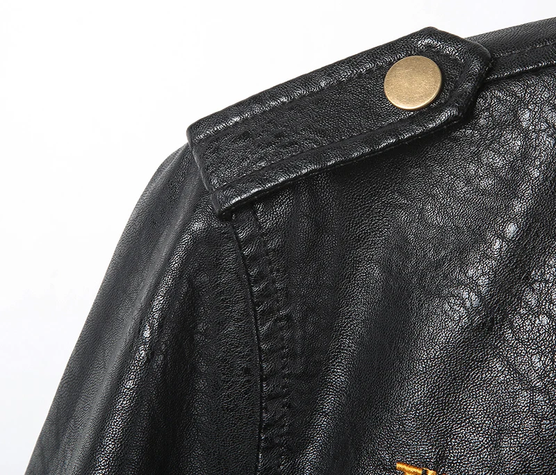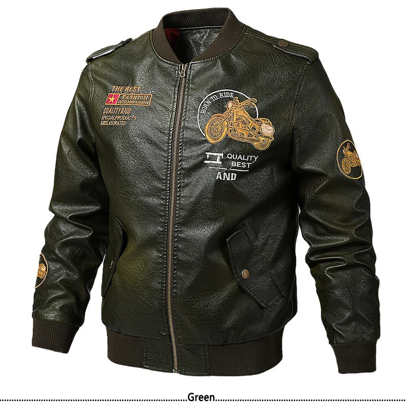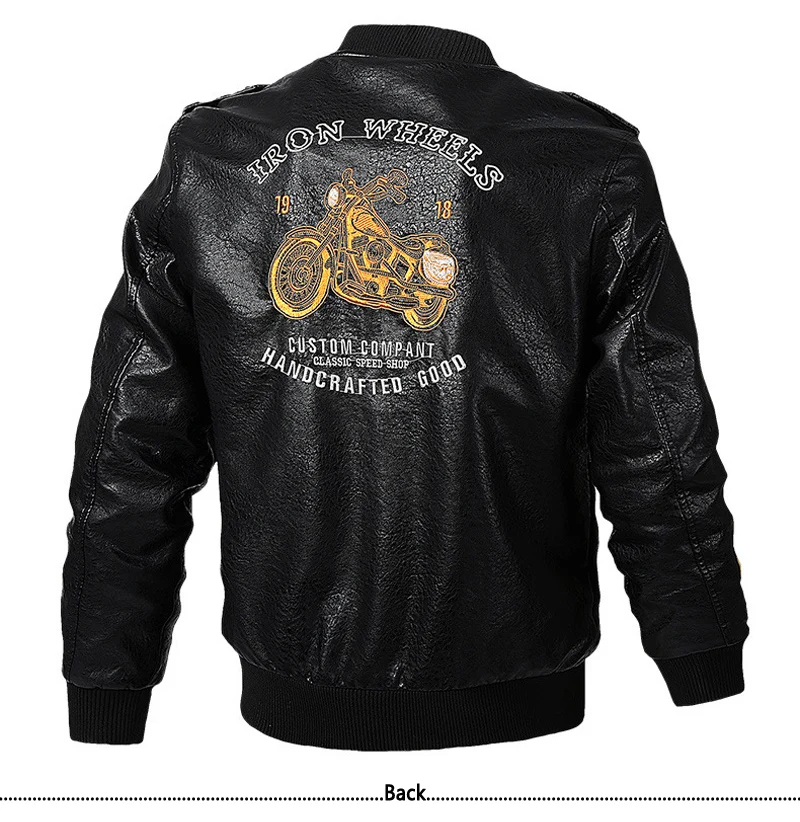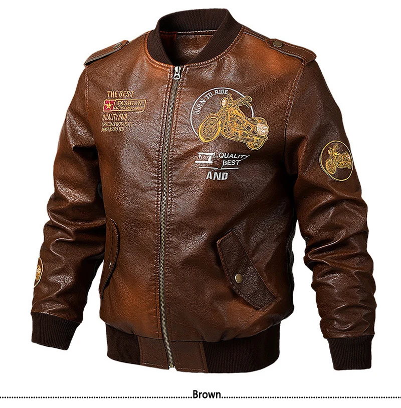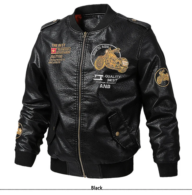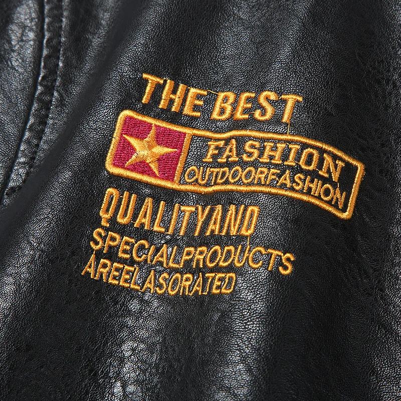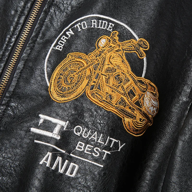 Куртка мужская Кожаная Мотоциклетная на молнии с воротником-стойкой и вышивкой
