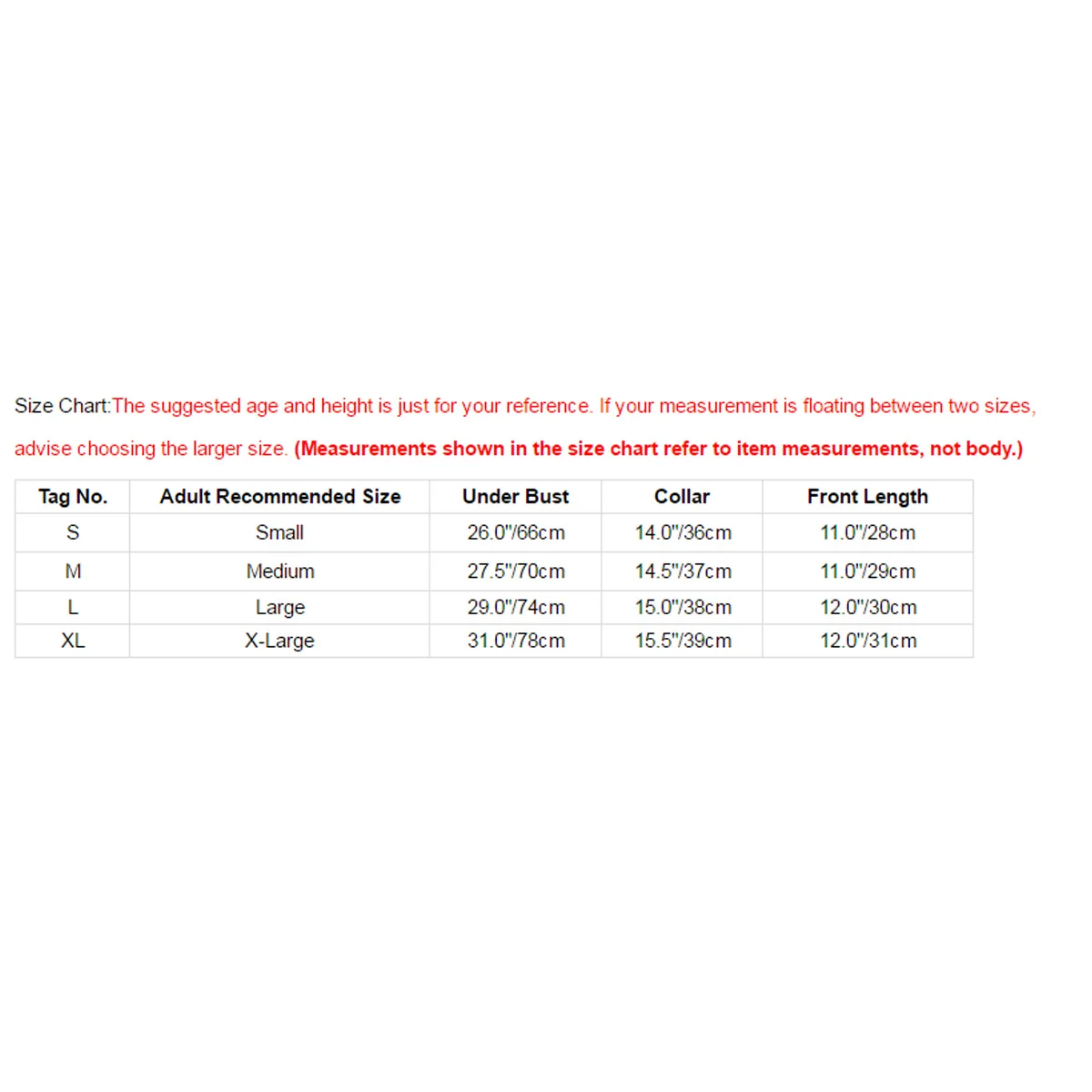 Номер бирки Рекомендуемый размер для взрослых Под грудью Воротник Длина спереди S Маленький 26,0 "/66 см 14,0 "/36 см 11,0 "/28 см М Средний 27,5 "/70 см 14,5 "/37 см 11,0 "/29 см L Большой 29,0 "/74 см 15,0 "/38 см 12,0 "/30 см XL X-Large 31,0 "/78 см 15,5 "/39 см 12,0 "/31 смПолезные советы: Замеры делаются вручную, поэтому учитывайте небольшие погрешности. Цвет на фото может немного отличаться от реального товара из-за особенностей цветопередачи различных мониторов.