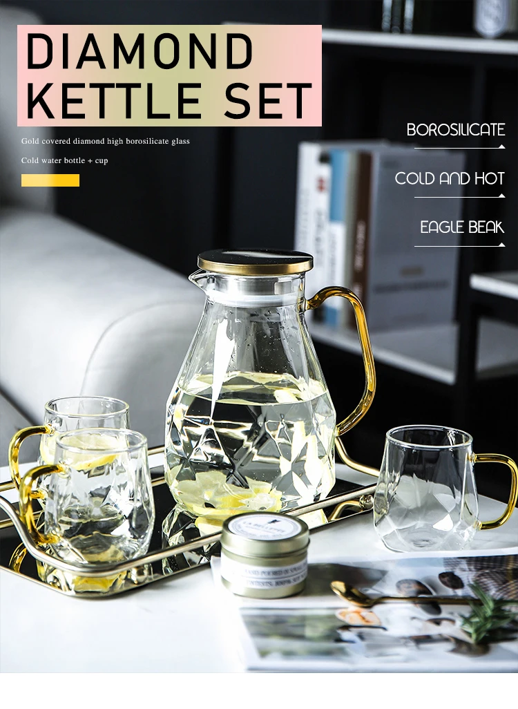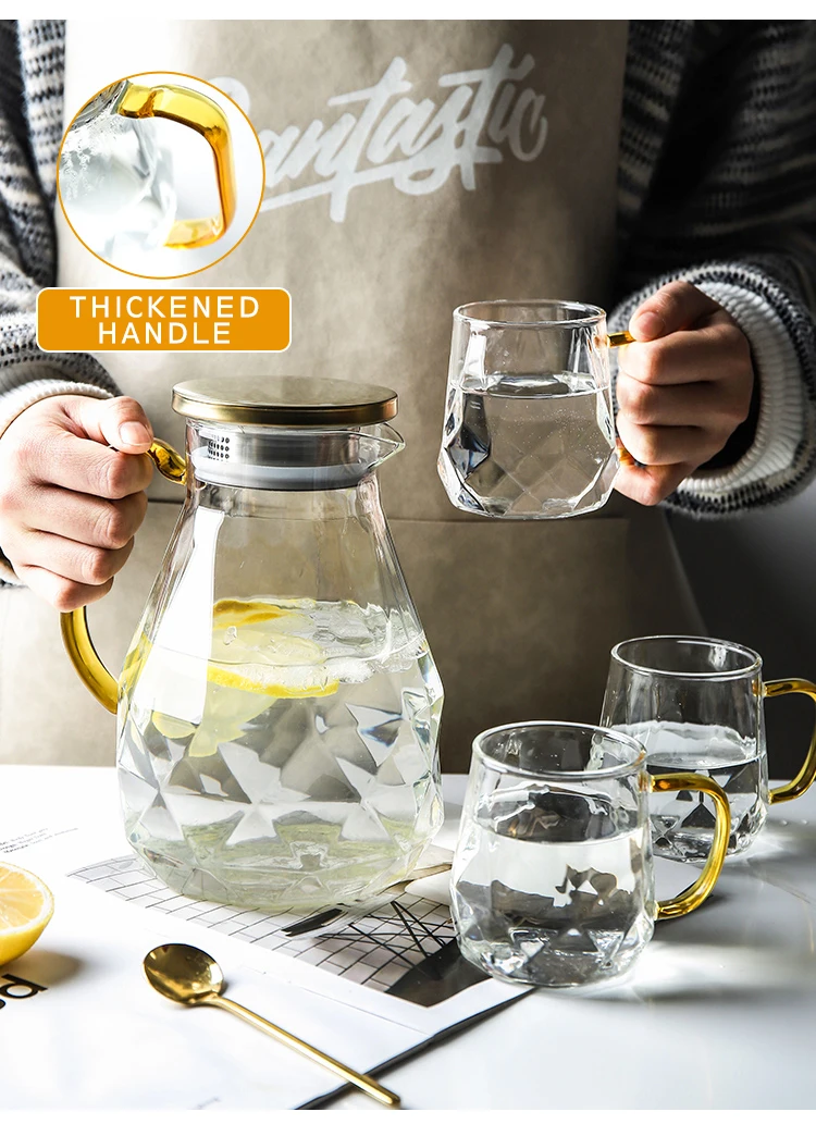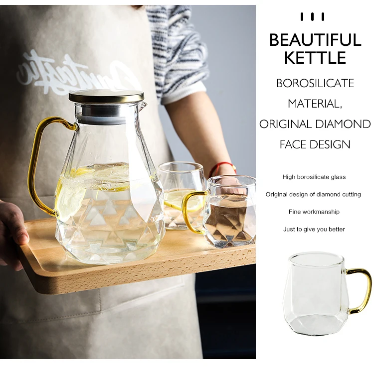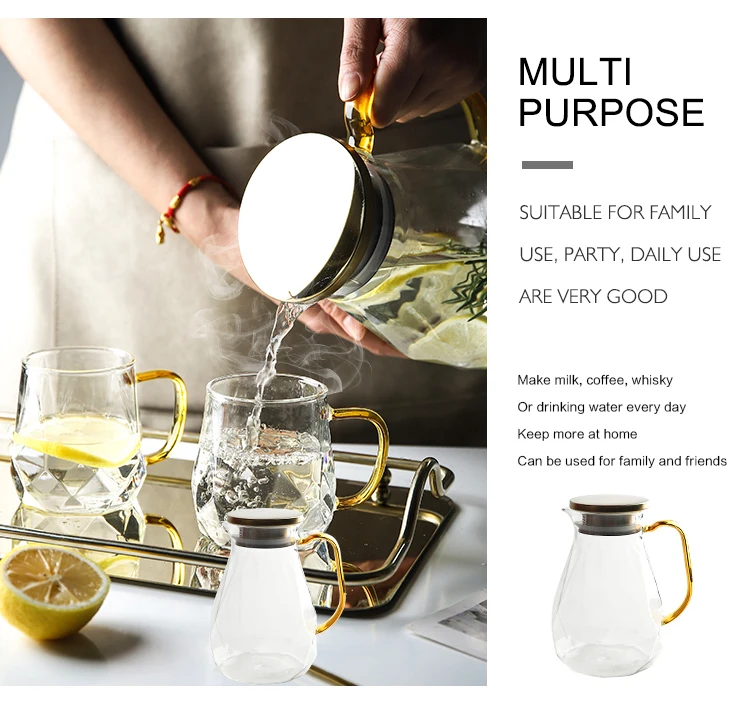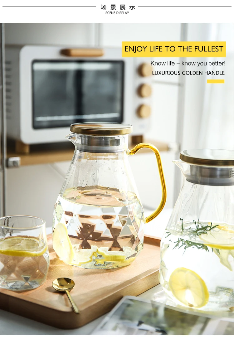 -- Специальный стеклянный материал имеет низкое расширение, высокую прочность, высокую твердость, высокий светильник и высокую химическую стабильность. Этот чайник устойчив и безопасен в использовании. -- Продукт может быть не только заполнен холодной водой, но и нагревается открытым огнем, прост в использовании. -- Изготовлено из нержавеющей стали марки 304, двухсторонний фильтр может эффективно фильтровать воду для удовлетворения потребностей различных сезонных напитков. -Уникальный дизайн привлекает внимание и делает питьевую воду приятной. -Большая вместимость, идеально подходит для семейного использования. -- С широким отверстием, вы можете легко очистить его. -- Стеклянный чайник принимает двойное Силиконовое кольцо для уплотнения, максимально сохраняет свежесть.