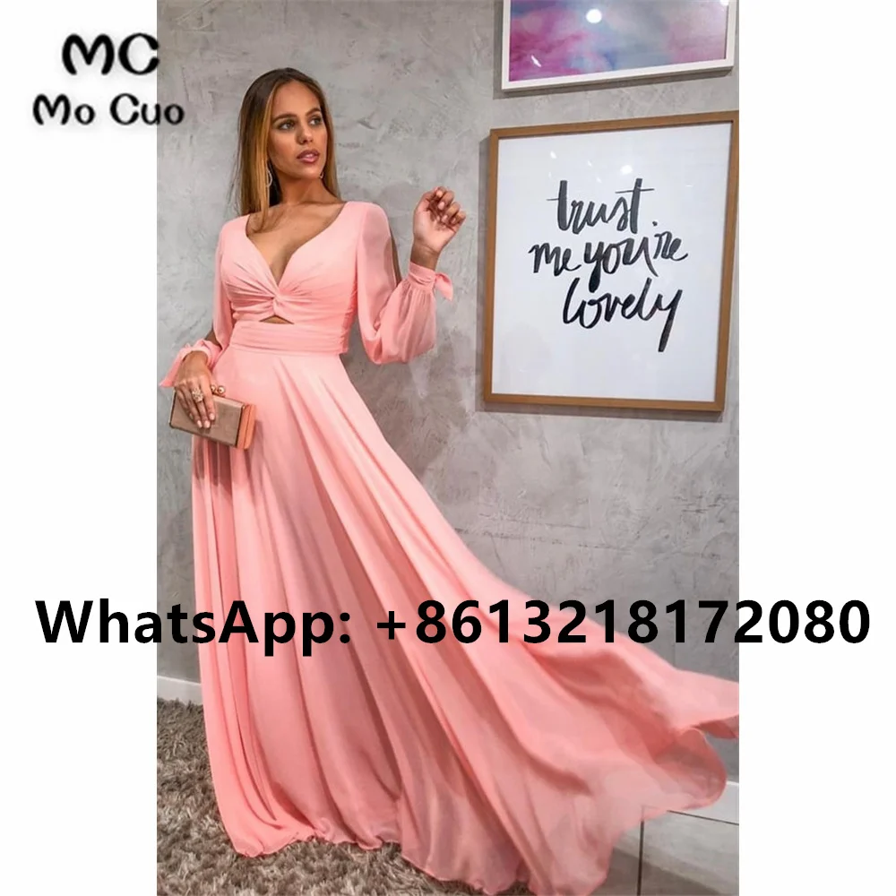 Женское шифоновое вечернее платье до пола, розовое платье с длинным рукавом и глубоким V-образным вырезом для выпускного вечера, 2021