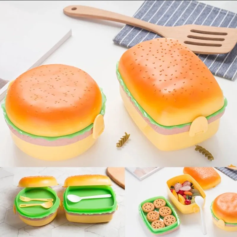 Милый гамбургер двухуровневый Ланч-бокс для бургеров Bento детский Ланч-бокс школьный контейнер для еды набор посуды с вилкой