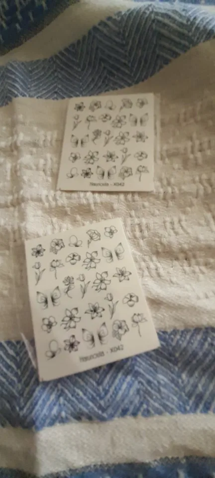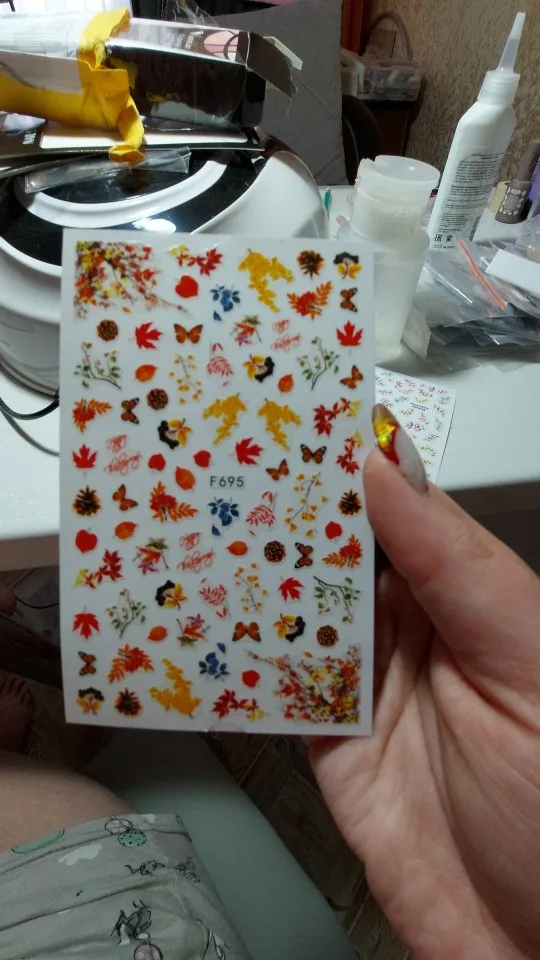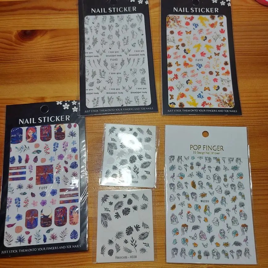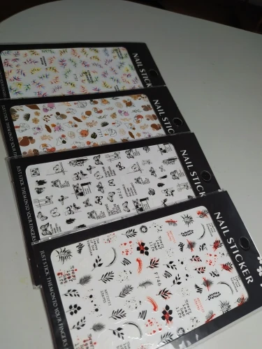 Всё пришло быстро, довольна товаром. Наклейки, тонкие, на прозрачной подложке, можно использовать с любым цветом лака.