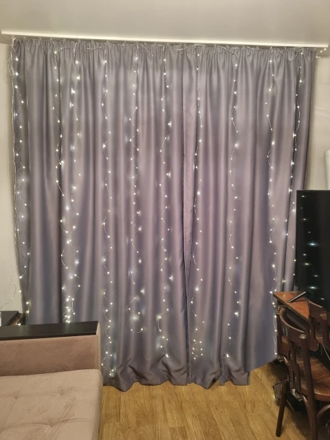 Красивая LED гирлянда штора с управлением от пульта ДУ. 8 режимов свечения, таймер, 10 уровней яркости На самом адаптере USB есть кнопка переключения режимов Питание через USB. Шнур длинный - 2 метра Основной провод в прозрачной оплётке, 10 подвесок со 200 диодами медные, скручены в спираль, очень легкие и воздушные, светодиоды не греются. Батарейки C2025 в пульте не было, покупала. Закрепила гирлянду на крючках карниза для шторы и любуюсь! Доставка за 12 дней в "Пятерочку"