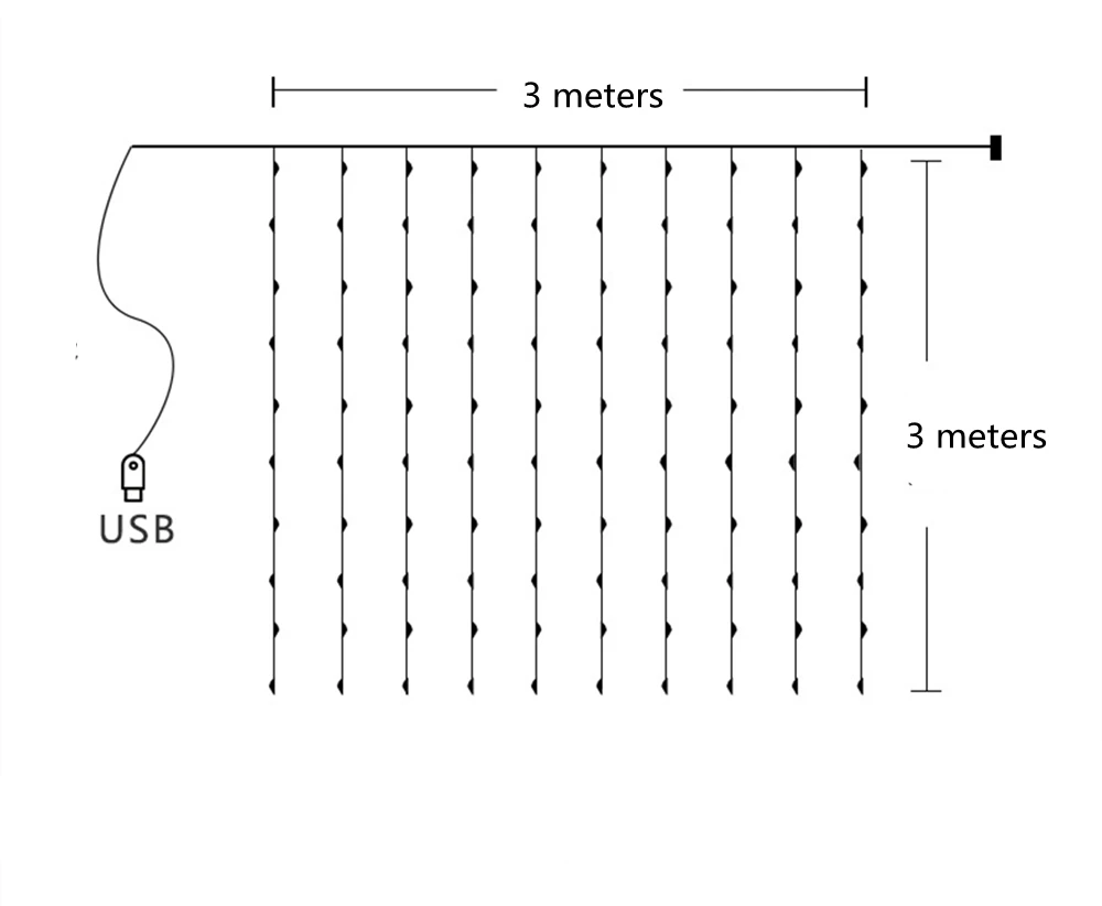 отличная гирлянда! 3 на 3 метра. основной провод полупрозрачный, от него идет 10 ответвлений - тонкие проволочки со светодиодами, благодаря этому гирлянда лёгкая. ее можно закрепить хоть на карнизе, хоть на стене. я это сделала с помощью обычного скотча. пульт без батарейки (нужна C2025). включает 8 режимов мерцания и 10 степеней яркости. также режимы переключаются кнопкой на самой гирлянде. длина шнура от начала гирлянды до USB коннектора около 2 метров. качество отличное - без посторонних запахов, светодиоды яркие, не перегреваются. гирлянда была аккуратно смотана, поэтому не запуталась.