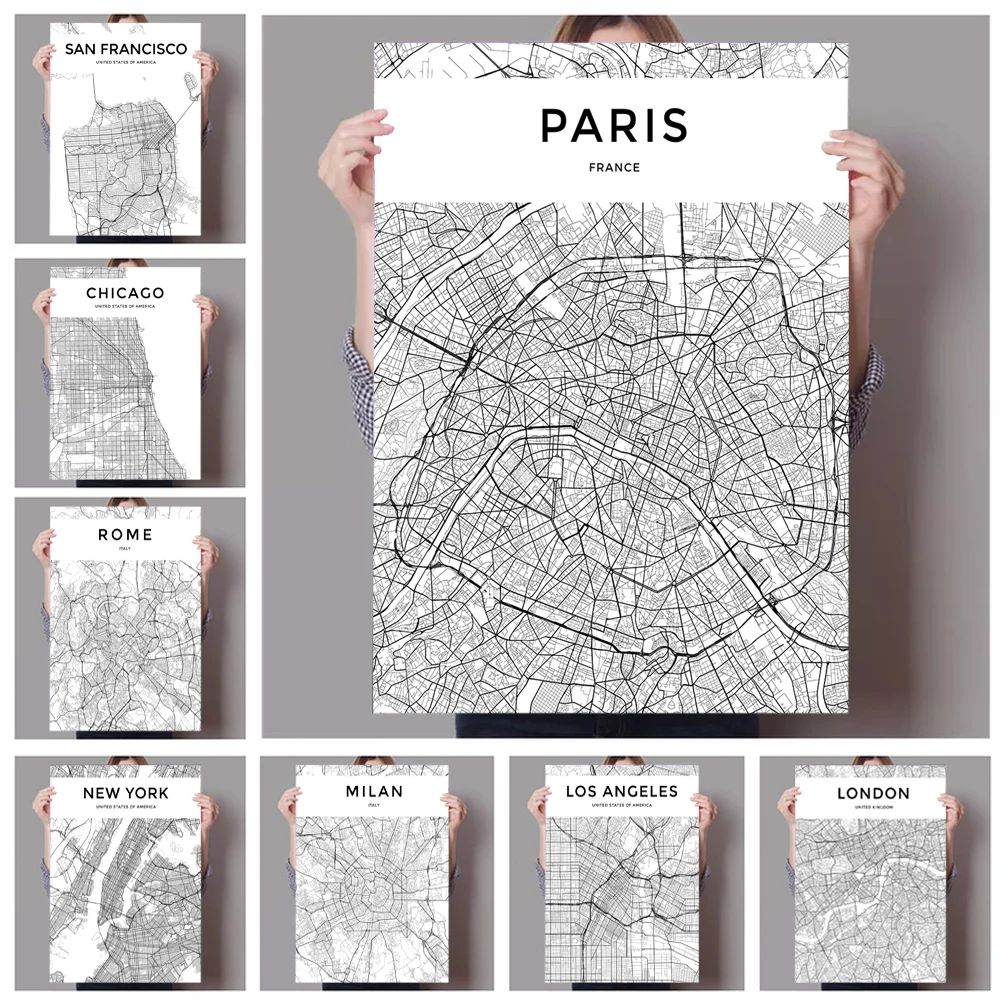 Скандинавская модная черно-белая известная Карта города, печать на холсте, скандинавский постер, художественная живопись, картина для гостиной, украшение для дома