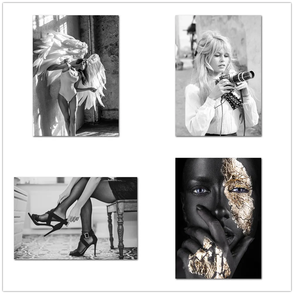 Черные, белые крылья ангела, модный постер, Золотая, серебряная женщина, холст с принтом, картина, сексуальная, красивая девушка, винтажная картина, домашний декор