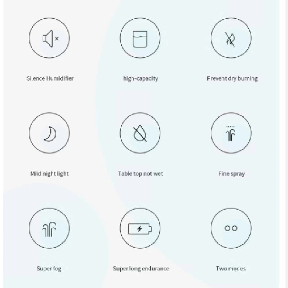 Особенности:1. Многофункциональность: увлажнитель, очиститель воздуха. Повышает влажность воздуха и уменьшает количество пыли и бактерий. Увлажняет кожу и дает ощущение спа.2. Низкий уровень шума: шум этого продукта очень мал во время работы и не вызовет дополнительных помех.3. Автоматическое отключение: поддержка функции автоматического отключения без воды, подключите и потяните источник питания USB, безопасно и надежно.4. Простая Зарядка: может легко питаться от автомобильных зарядных устройств, ПК, ноутбуков, мобильных блоков питания и многого другого.5. Красиво: Этот продукт изготовлен с функциональной изысканной мастерской, а внешний вид очень стильный и красивый.Описание:Этот увлажнитель подходит для спа, спальни, гостиной, ванной комнаты, комнаты для йоги, массажного места, офиса, приемной и т. д.Характеристики:Продолжительное распыление по времени: 5 часовРаспыление в фиксированное время: 5 часовЕмкость резервуара для воды: 420 млМатериал изделия: абс + ПП + силиконРазмер продукта: 80*80*148 ммПотребляемая мощность: 1,5 ВтПосылка1 шт * увлажнительПримечания:1. Возможны отклонения в 0-1 дюйм из-за ручного измерения. Спасибо за понимание.2. Мониторы откалиброваны не одинаково, цвет товара, отображаемый на фотографиях, может немного отличаться от реального объекта.