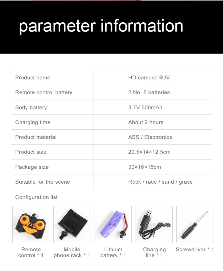 Характеристики:Название продукта: RC внедорожный автомобильЧастота: 2,4 ГГцКузова автомобиля Батарея Емкость: 3,7 V 500 мАч никель-кадмиевый БатареяАккумулятор пульта дистанционного управления: 2 батарейки типа АА (не входят в комплект)Время зарядки: около 120 минутВремя использования: около 20 минутРасстояние дистанционного управления: около 30 метровМатериал: АБС + металл + электронные компонентыРазмер посылка: 23.6x15.4x17.9 см/9.29x6.06x7.05inКоличество: 1 комплектПримечание:Возможны отклонения в 0-1 см вследствие измерений вручную. Пожалуйста, убедитесь, что вы не возражаете перед покупкой.Из-за разницы между различными мониторами изображение может не отражать фактический цвет изделия. Спасибо!Посылка включает в себя:1 х пульт дистанционного управления внедорожником1 х пульт дистанционного управления1 х USB кабель для зарядки1 х литиевая батарея1 x мобильный телефон держательОтвертка-1 шт. (демонстрация других аксессуаров на рисунке не включена.)