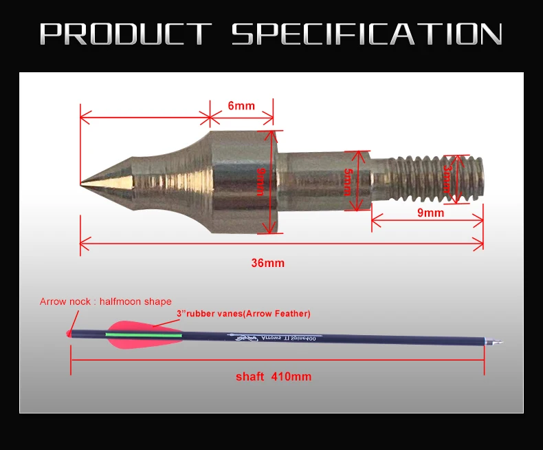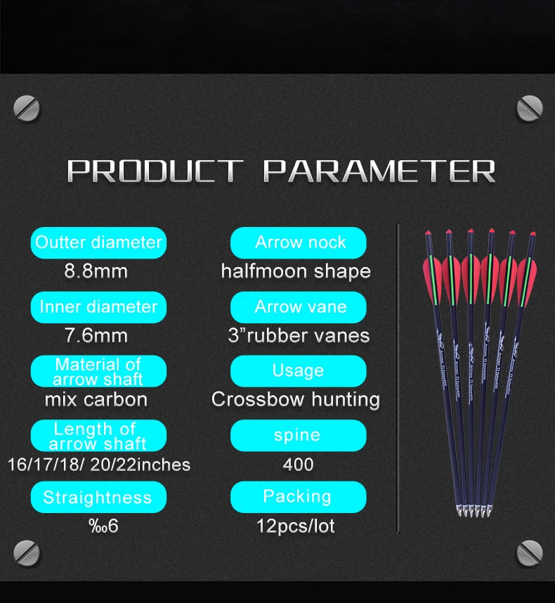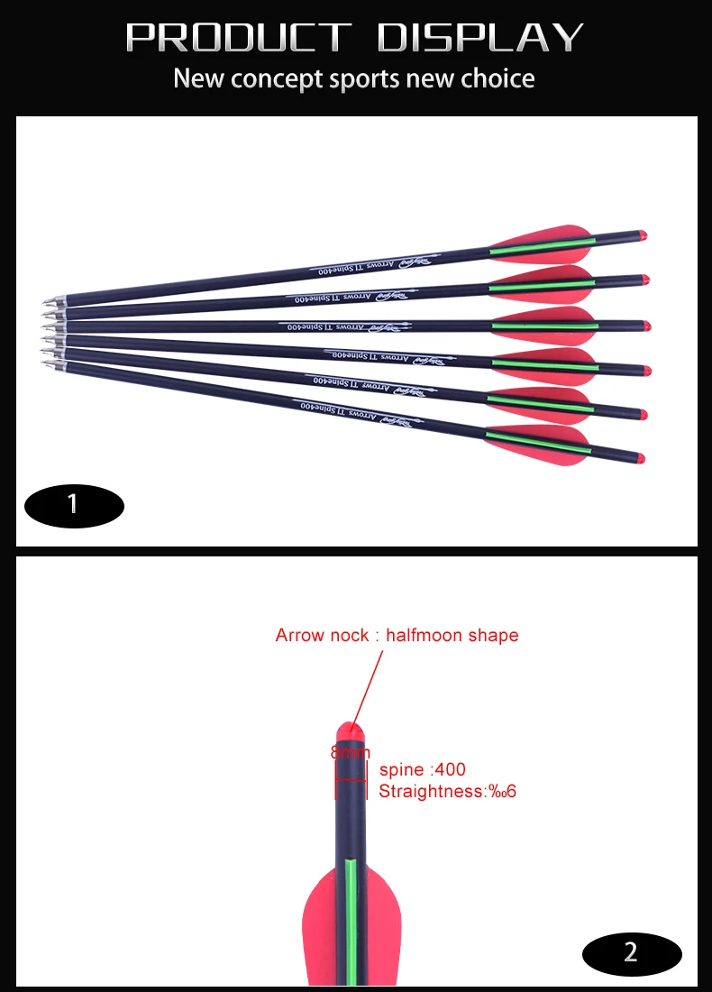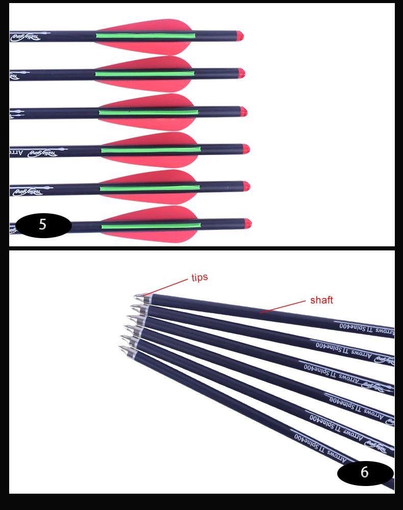 Название товара:Тип: стрелаМатериал голенища: углеродаПеро Материал: пластикПрименение: ОхотаМатериал наконечника: стальНаружный диаметр 8,8 ммВнутренний диаметр 7,6 ммМатериал древка стрелы, углеродная смесьДлина древка стрелы: 16 дюймов, 17 дюймов, 18 дюймов, 20 дюймов, 22 дюймаВес стрел: 125 зерноЛопатка для стрелы: 3 дюймаПозвоночника: 400Кол-во: 6