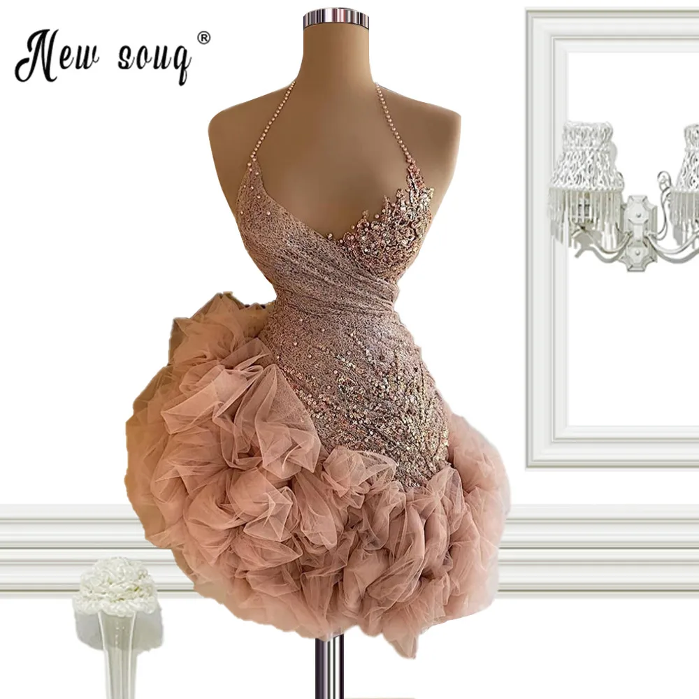 Розовое Тюлевое короткое коктейльное платье с оборками и бисером, Соблазнительные вечерние-платья с открытой спиной и прозрачной спиной для вечеринки, платье с лямкой на шее для встречи выпускников, 2021