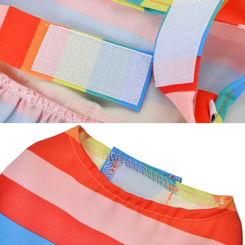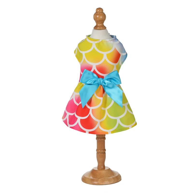Платье принцессы с бантом сделано из хлопка, ткань удобная и дышащая. Есть много различных стилей, в том числе Радужный, чешуя рыбы и горошек.