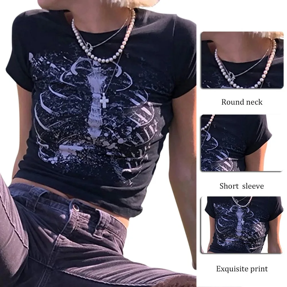 Женская футболка y2k, топы со скелетом, гранж, с графическим принто...