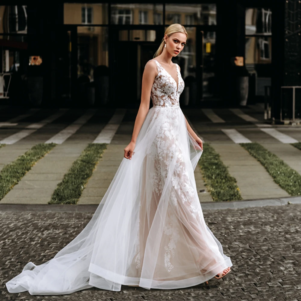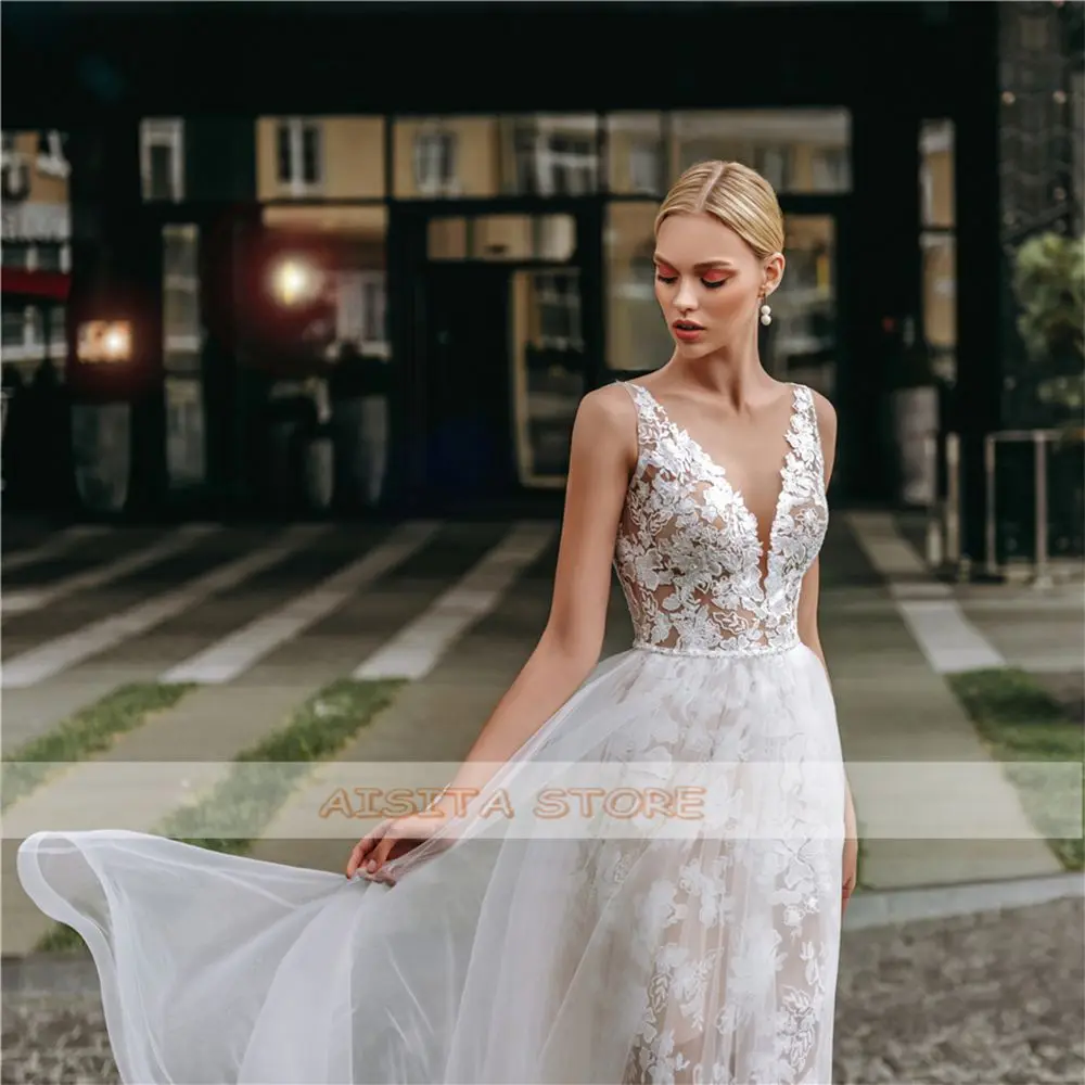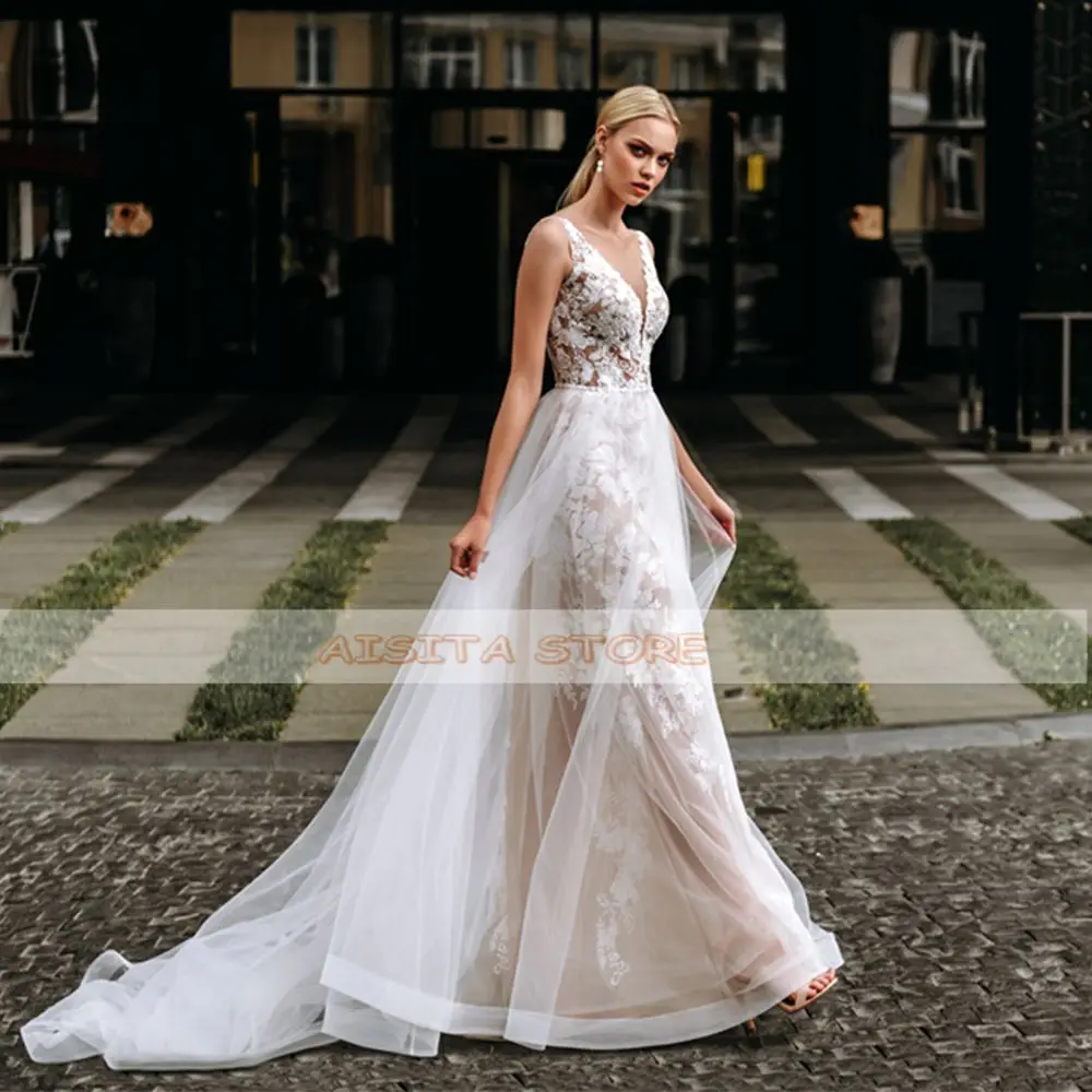 Свадебное платье-футляр с V-образным вырезом, без рукавов, с открытой спиной, со шлейфом, кружевной аппликацией, пляжные свадебные платья, платье Мари 2021