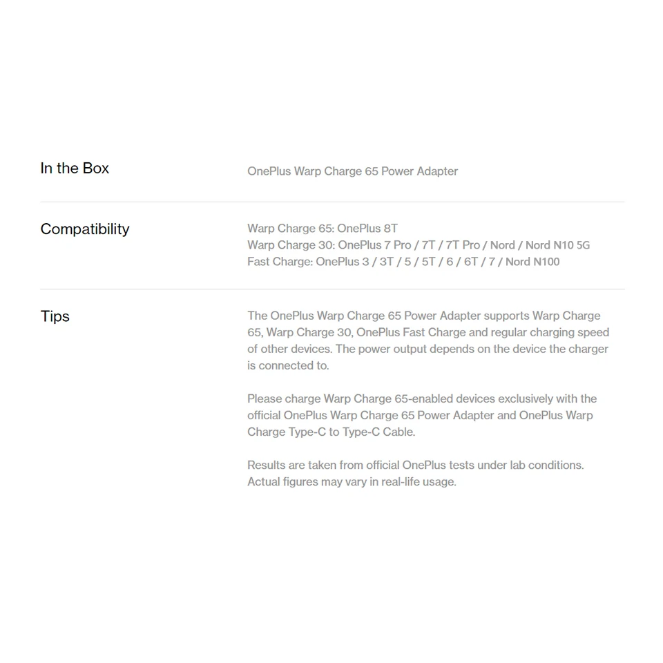 Устройство зарядное Oneplus Warp Charge, 65 Вт, Usb C, 65 Вт