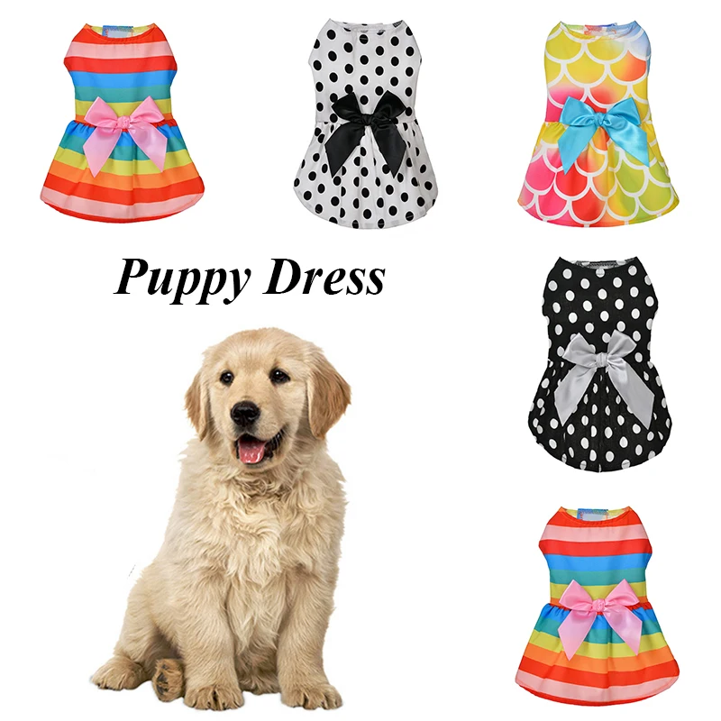 Платье принцессы с бантом для домашних животных изготовлено из хлопка, ткань удобная и дышащая. Существует много различных стилей, включая радужные, рыбные чешуи и горошек.