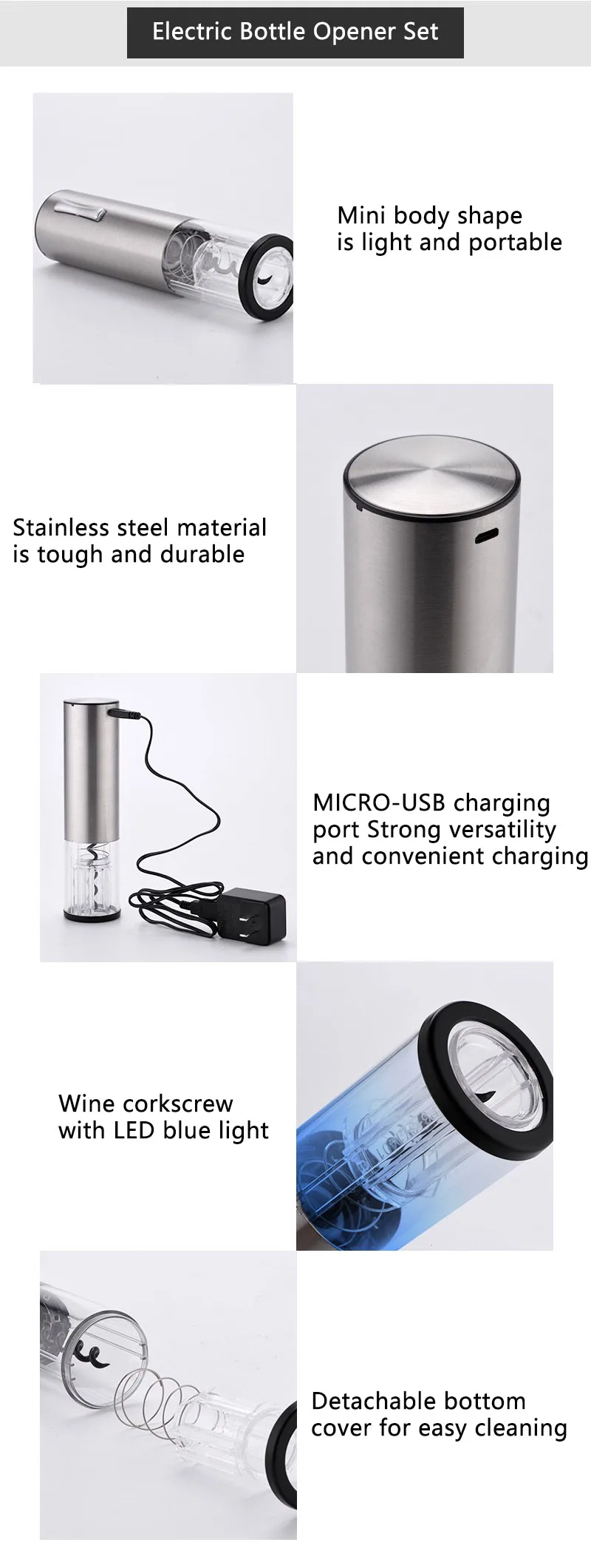 Название продукта: [перезаряжаемый] набор для открывания бутылок из нержавеющей стали Основной материал: нержавеющая сталь + высокая проницаемость PC нижний корпус + спиральный крючок из сплава Источник питания: Встроенная перезаряжаемая литиевая батарея Интерфейс зарядки: micro-usb Применимый рот для бутылки: <= 35 мм прямая бутылка для рта и выпуклая бутылка для рта Посылка включает в себя: открывалка для бутылок * 1, резак из оловянной фольги * 1, usb-кабель для зарядки * 1, руководство * 1, коробка на английском языке * 1