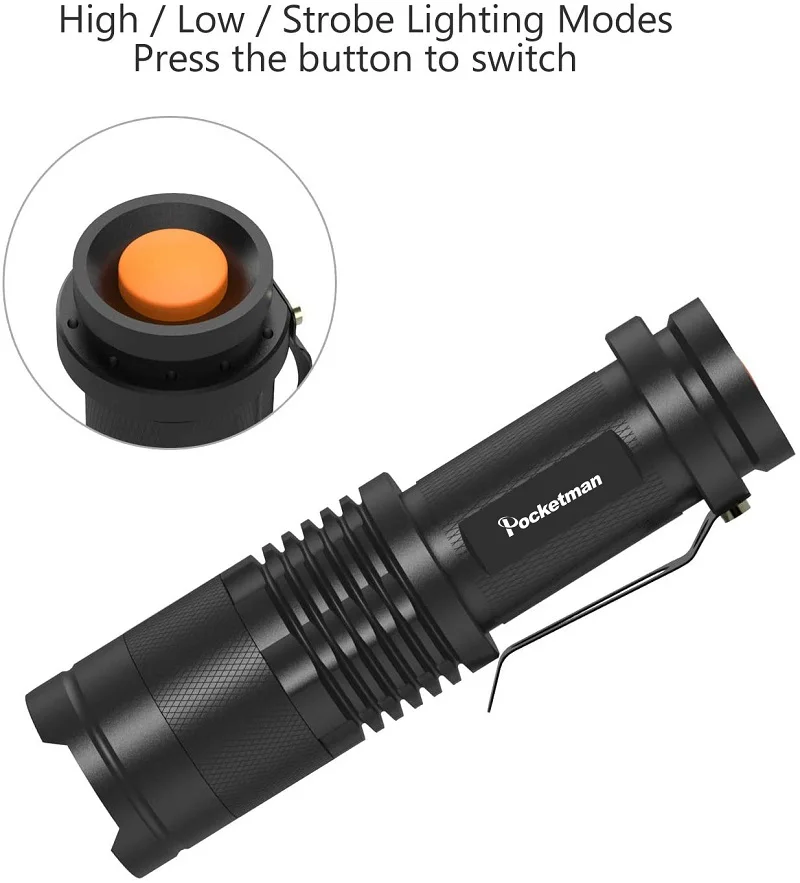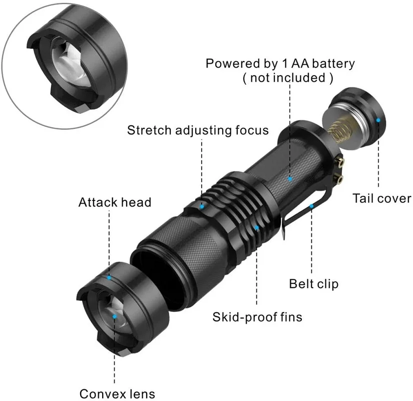 Супер Мини размер, яркий, ослепляющий эффект.Противоскользящий дизайн и водонепроницаемый дизайн.Выход яркий может прийти к 6000 люменов (макс.).Регулируемый диапазон фокусировки для различного использования, растягивается для регулировки фокуса.Зажим для удобной переноски.Рабочее напряжение широкое и может использовать батареи в самой большой степени.Подходит для охоты, велоспорта, альпинизма, кемпинга и активного отдыха и т. д.Примечание: Пожалуйста, избегайте воздействия непосредственно на глаза и не забудьте вынуть аккумулятор, если не использовать в течение длительного времени.