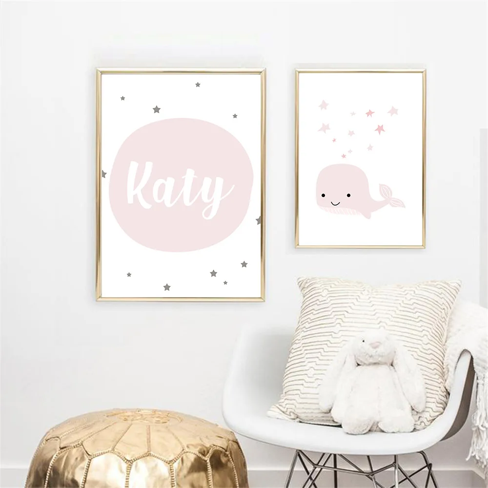 Персонализированная картина с именем на заказ, настенный постер с принтом розового Кита для детской комнаты, Детские принты, настенные картины в скандинавском стиле, декор для комнаты для девочек