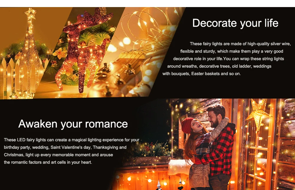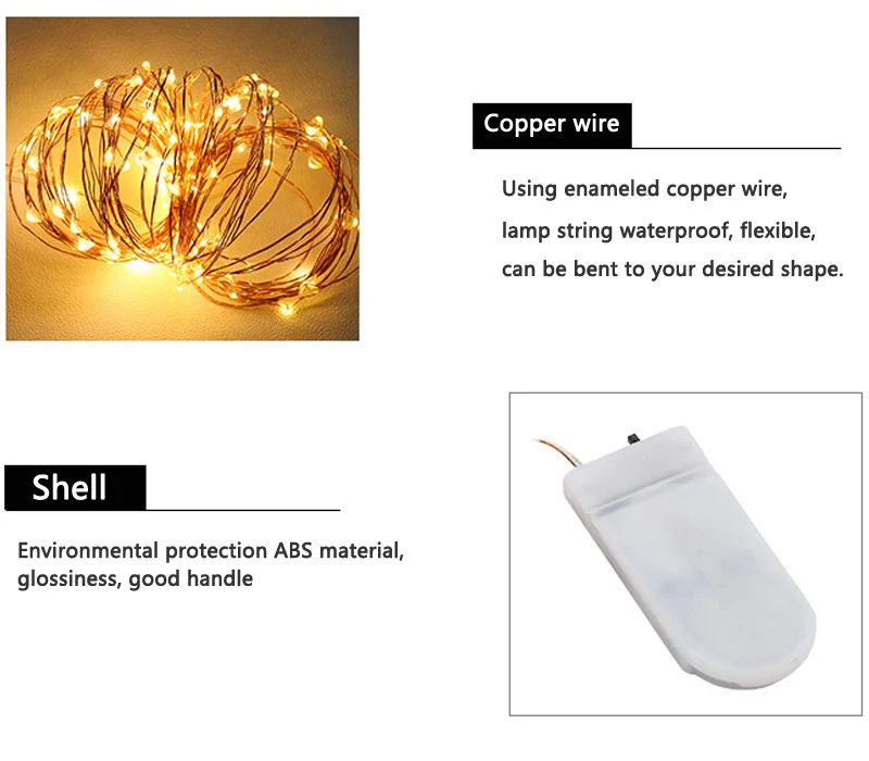 Питание от 2 шт. * батареи CR2032 (не входят в комплект)Материал: медная проволока и ПВХДлина: 2 м/3 м/5 мРасстояние между 2 светодиодами: 10 см (4 дюйма)Количество светодиодов: 20 светодиодов/30 светодиодов/50 светодиодов3 режима: вкл. (постоянное включение); ВЫКЛ.Водонепроницаемость: Да, батарейный отсек хорошо защищен при использовании в дождливые дниНапряжение питания: 3 в Посылка включает:1 Светодиодная гирлянда для аккумулятора (батарея в комплект не входит)
