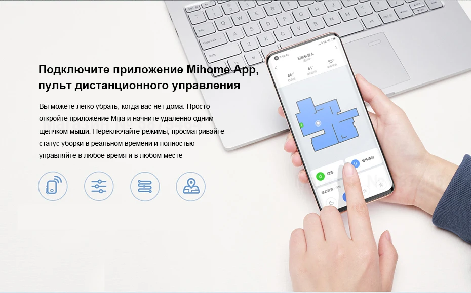 Вы легко можете очистить, когда вас нет дома. Просто откройте приложение Mijia и запустите удаленно одним кликом. Переключение режимов, просмотр состояния очистки в реальном времени и полный контроль в любое время и в любом месте.