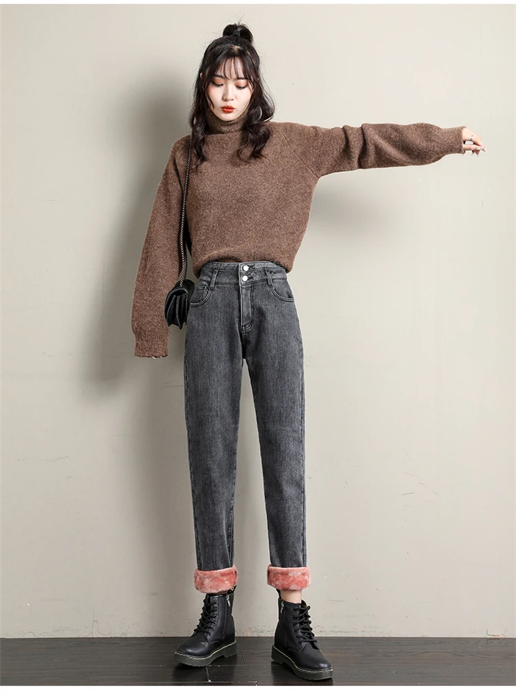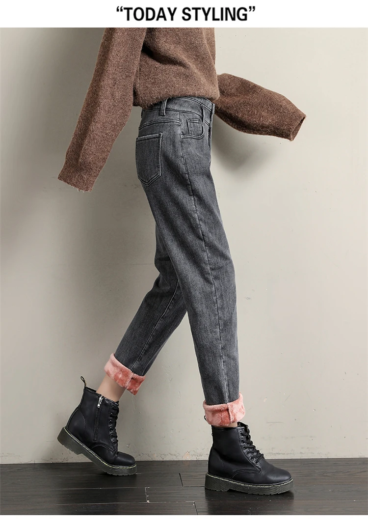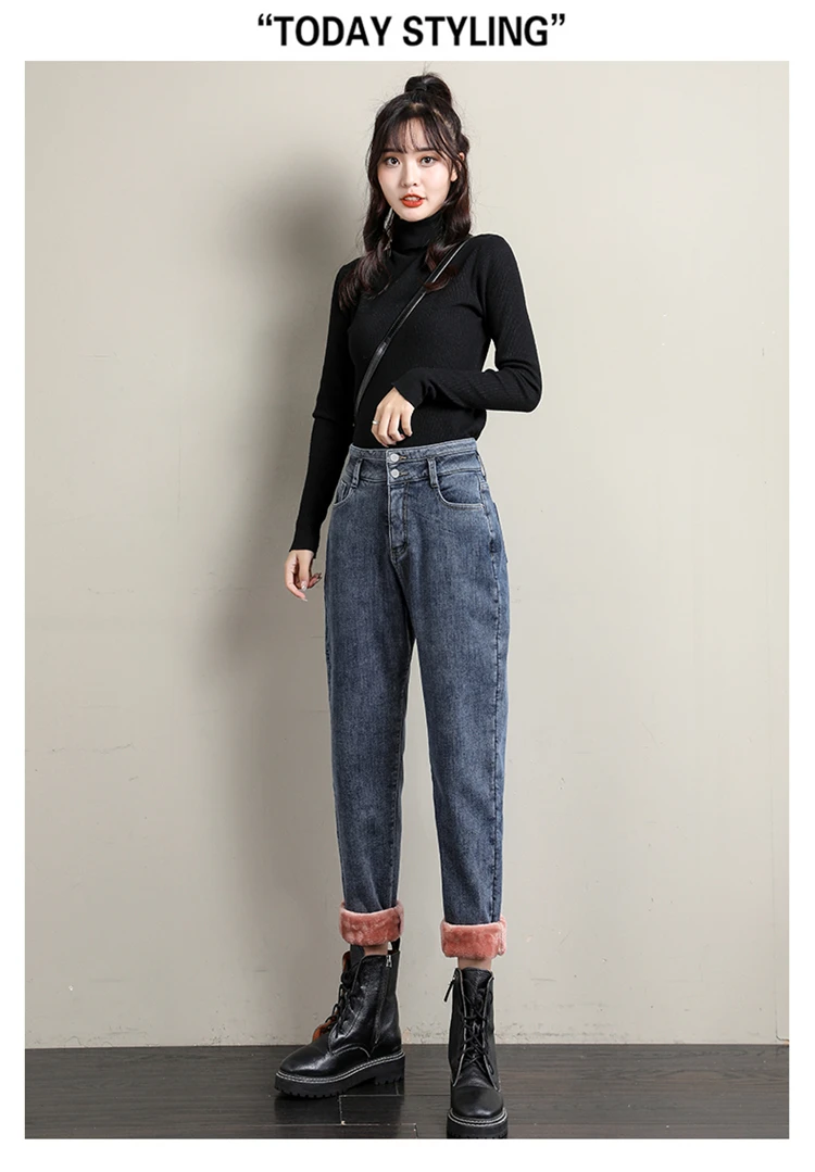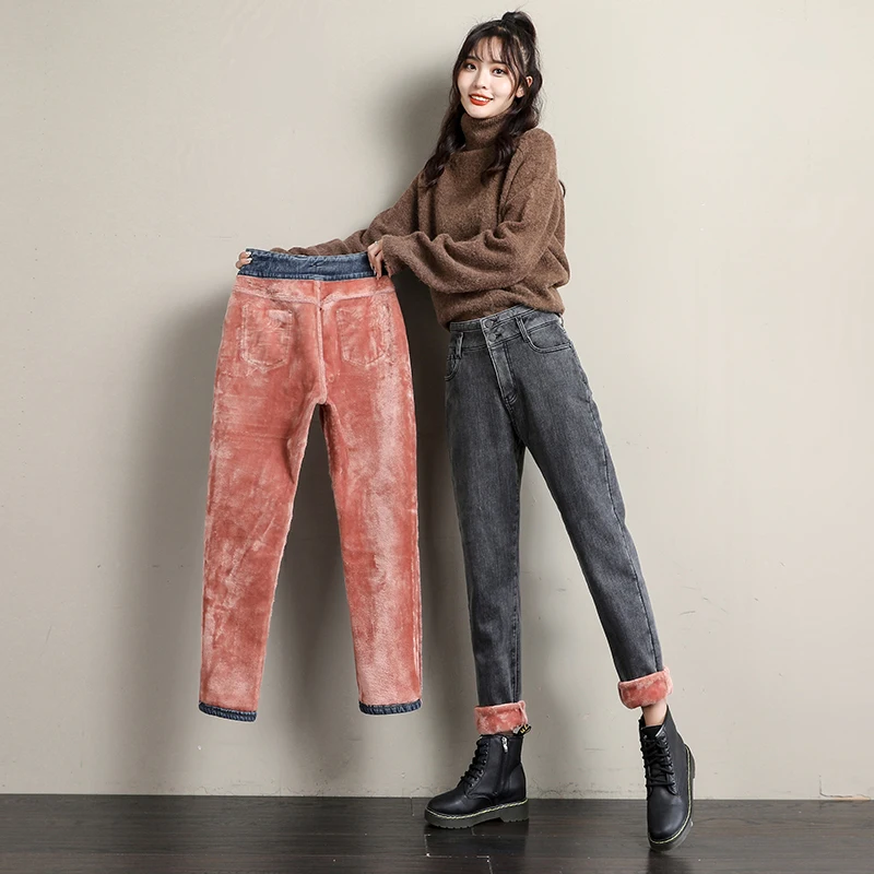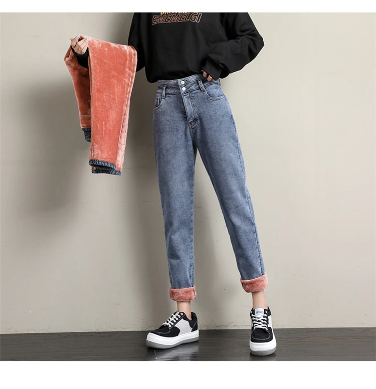 Новые зимние женские шерстяные джинсы с высокой талией плюс бархатн...