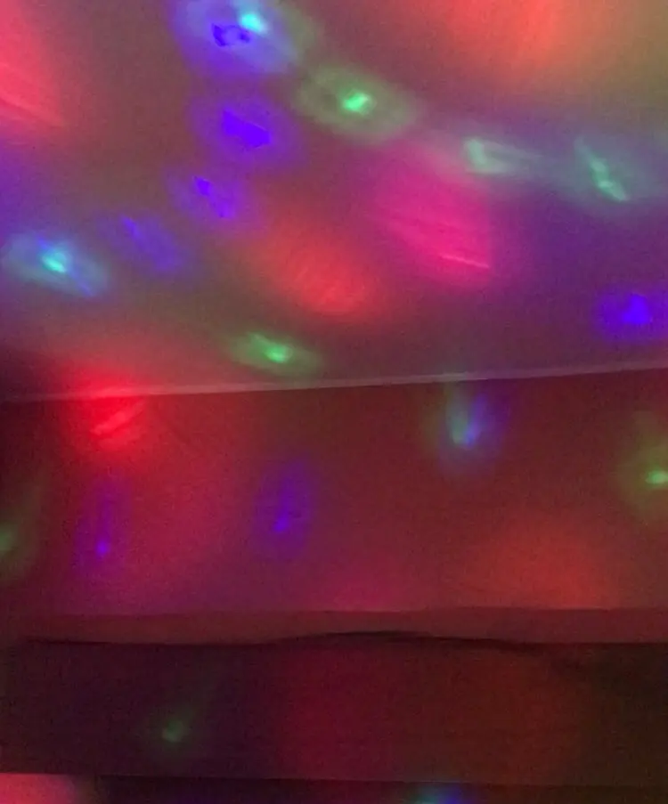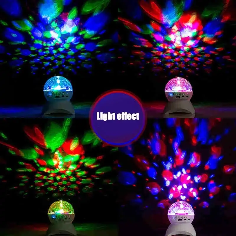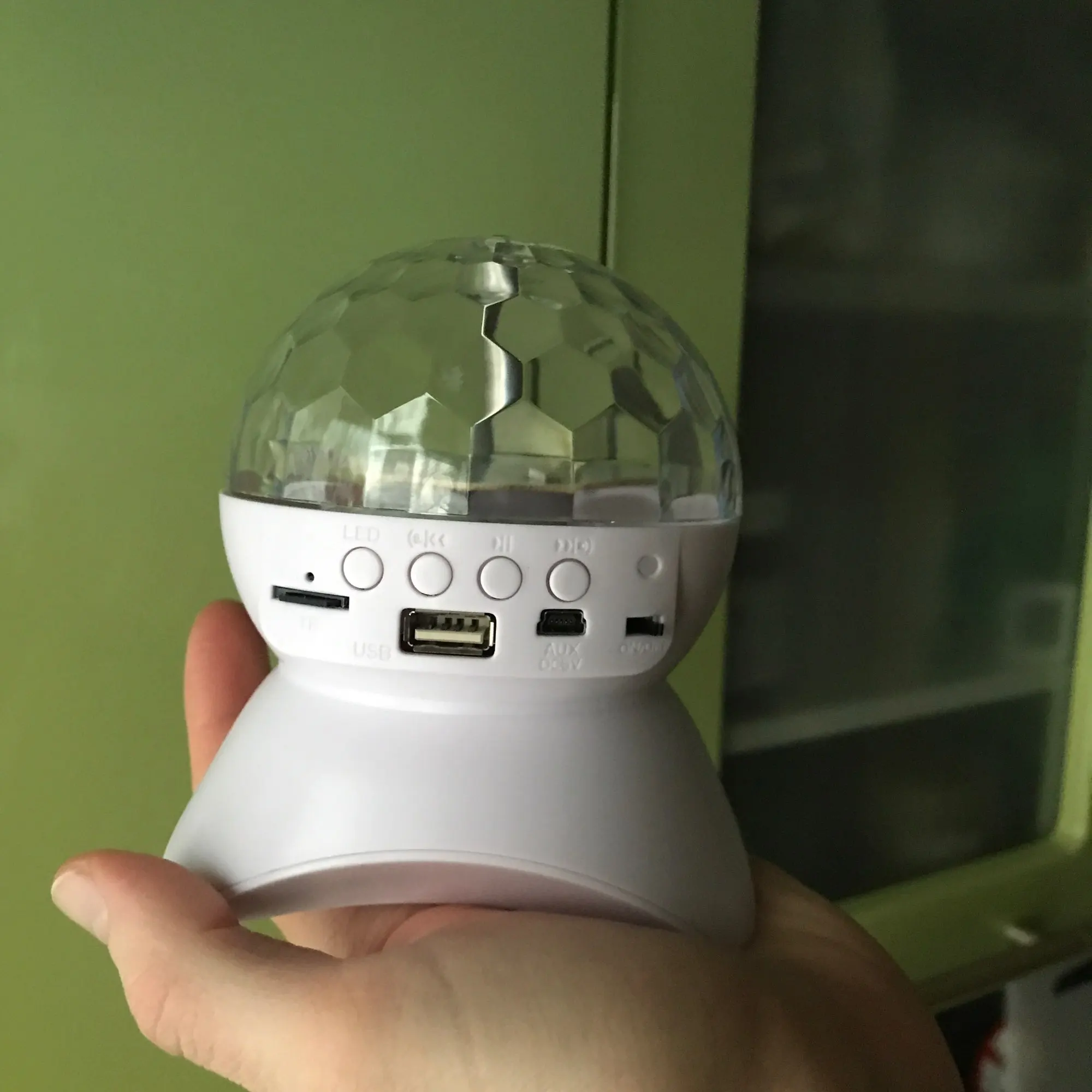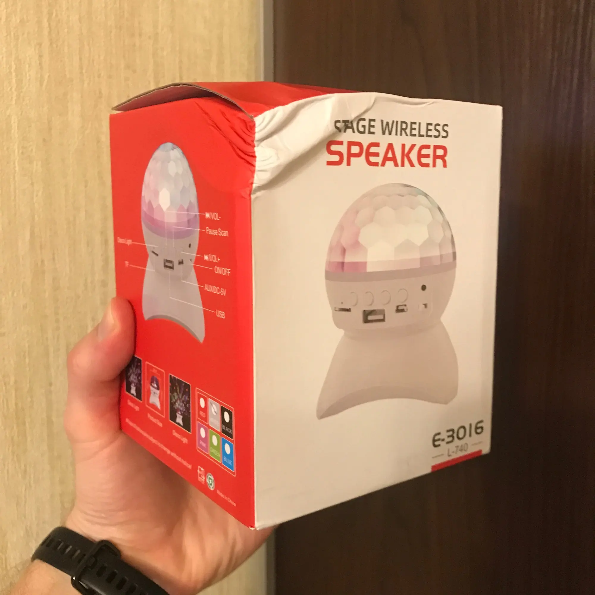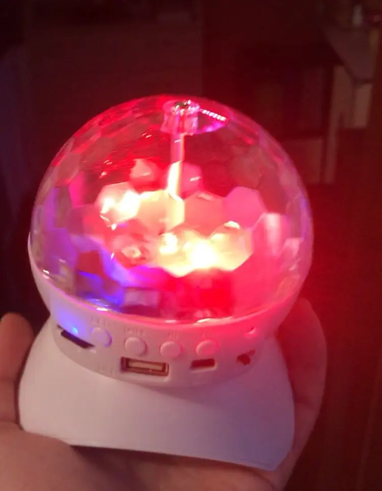 Коробка приехала помятая, но шар не пострадал. В комнате диско закатить - самое то! Фото не передают всю яркость и разнообразие огней, т.к. цвет сменяем один другой - а фото это только один набор цветов за долисекунду Кнопки достаточно хлюпинькие, а разъём провода отправляет нас в год 2005, когда его использовали в автомобильных навигаторах )) Звук достаточно громкий, карту памяти читает быстро без тормозов. В целом очень доволен, что могу без розетки устроить праздник в любом месте! За свои деньги - считаю отличным приобретением!