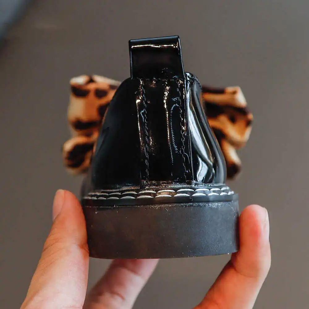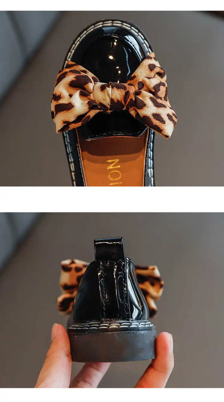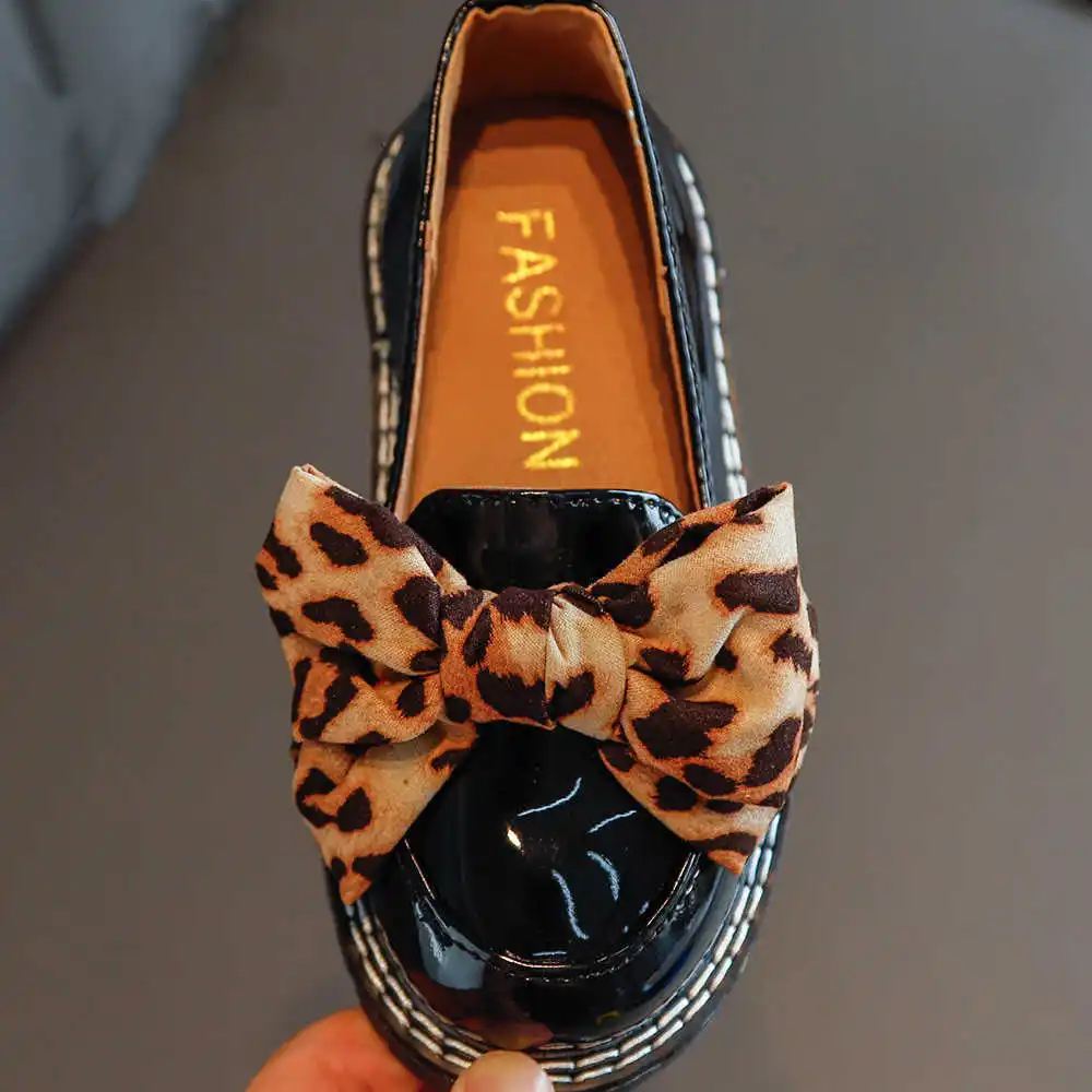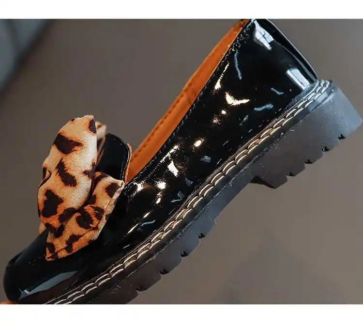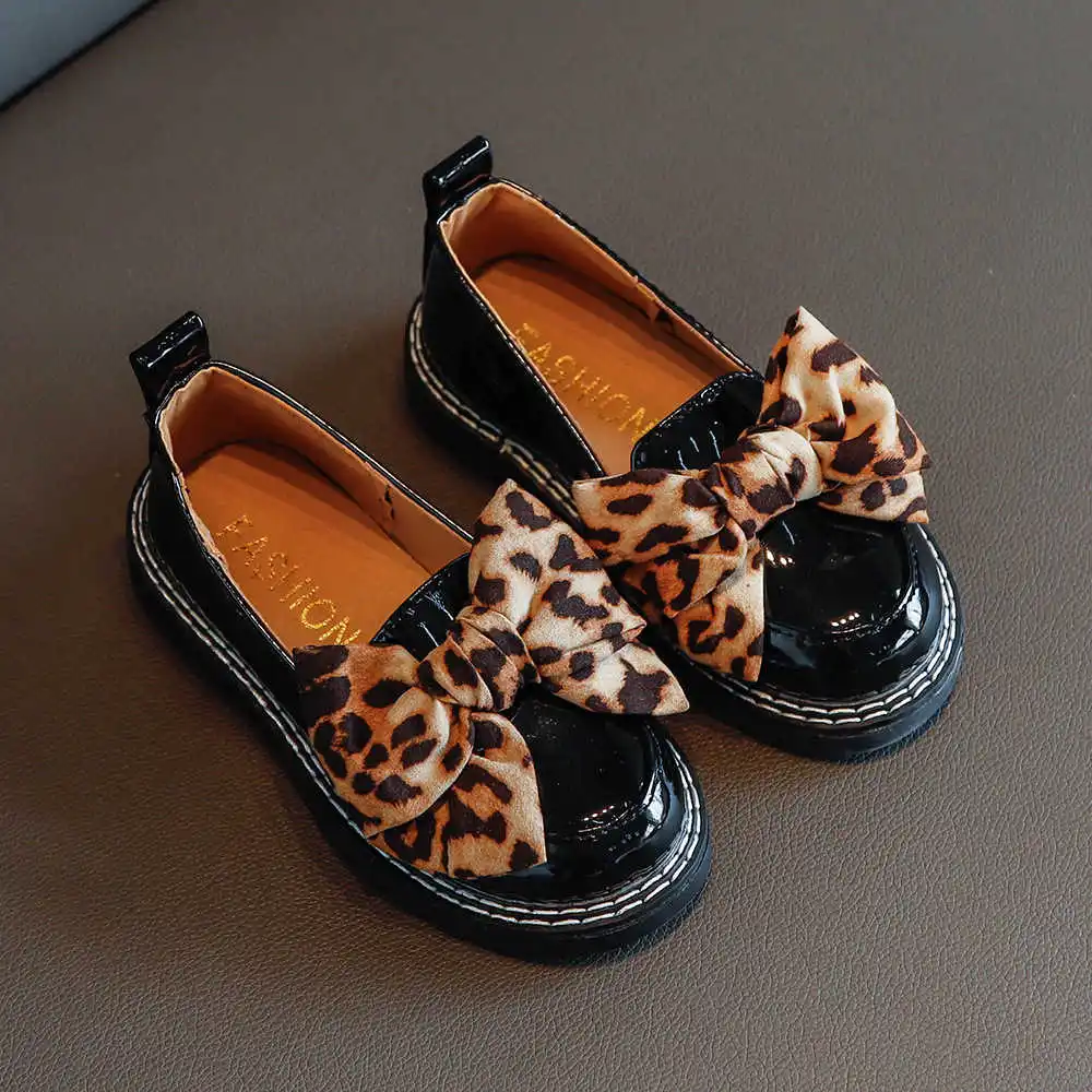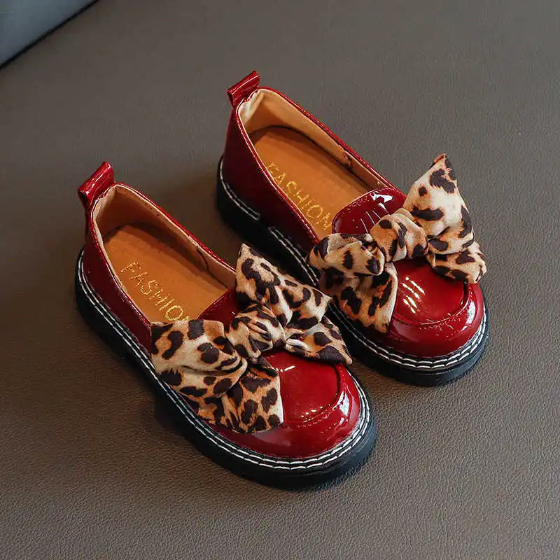 2021, кожаные туфли для девочек, милые детские туфли принцессы с бантом и лентами, с бантом, на плоской подошве, леопардовые Нескользящие туфли с закрытым носком, D826